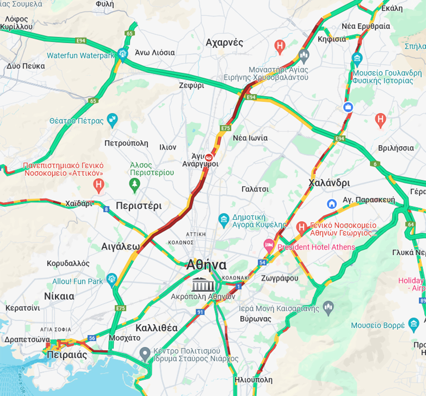 Με χαμηλές ταχύτητες κινούνται οι οδηγοί στην Αθηνών Κορίνθου από το Δαφνί και στον Κηφισό από την οδό Δυρραχίου έως την οδό Λαχανά.