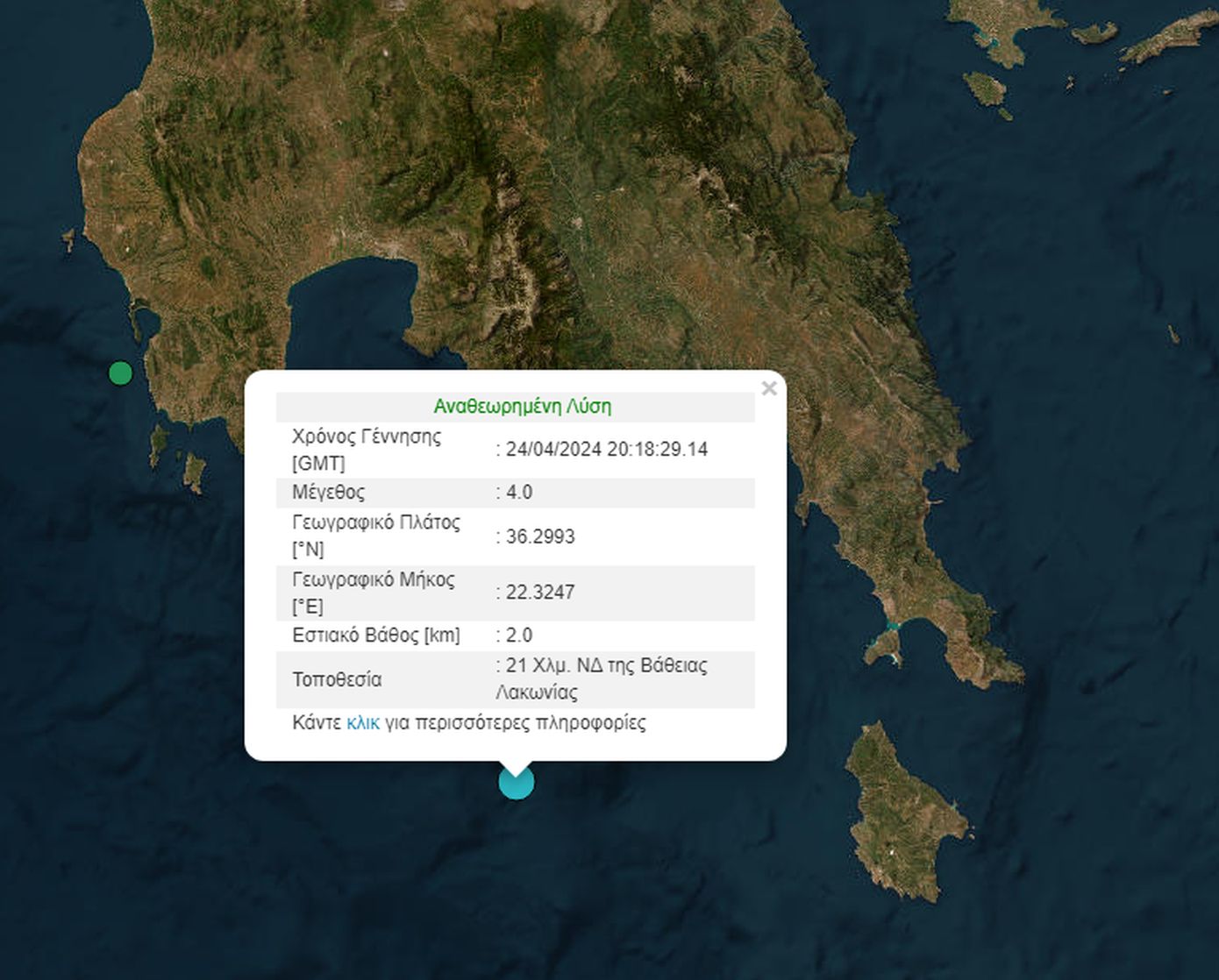 Η σεισμική δόνηση έλαβε χώρα στις 23:18 ενώ το επίκεντρο, σύμφωνα με το Γεωδυναμικό, ήταν 21 χιλιόμετρα νότια-νοτιοδυτικά της Βάθειας Λακωνίας.