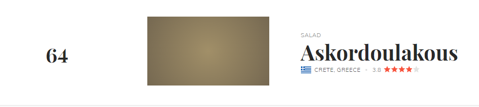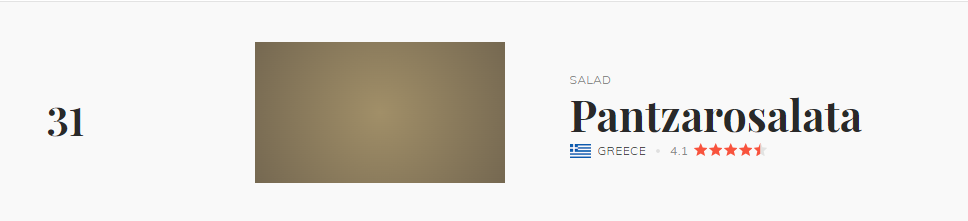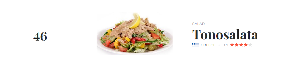 Στις υπόλοιπες θέσεις της λίστας του «Taste Atlas» βρίσκουμε τα χόρτα, την πατατοσαλάτα, την παντζαροσαλάτα, την τονοσαλάτα, τους βολβούς και τη λαχανοσαλάτα.