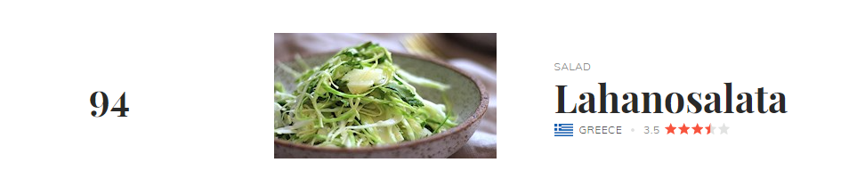 «Η ελληνική σαλάτα, γνωστή και ως χωριάτικη, είναι το εθνικό πιάτο της Ελλάδας, που αποτελείται από ντομάτες, κρεμμύδια σε φέτες και χοντρές φέτες αγγουριού. Ανάλογα με την περιοχή, μπορεί να υπάρχουν επίσης ελιές, πράσινες πιπεριές, τυρί φέτα, ρίγανη, αλάτι, πιπέρι ή ένα ντρέσινγκ από ελαιόλαδο και λεμόνι ή ξύδι (προαιρετικά).