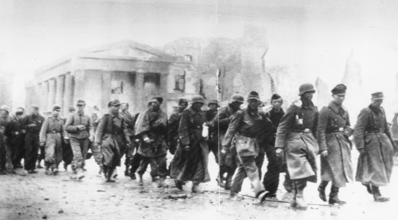 1945: Η Σοβιετική Ένωση ανακοινώνει την πτώση του Βερολίνου. Η κόκκινη σημαία με το σφυροδρέπανο κυματίζει στον ιστό του Ράιχσταγκ.