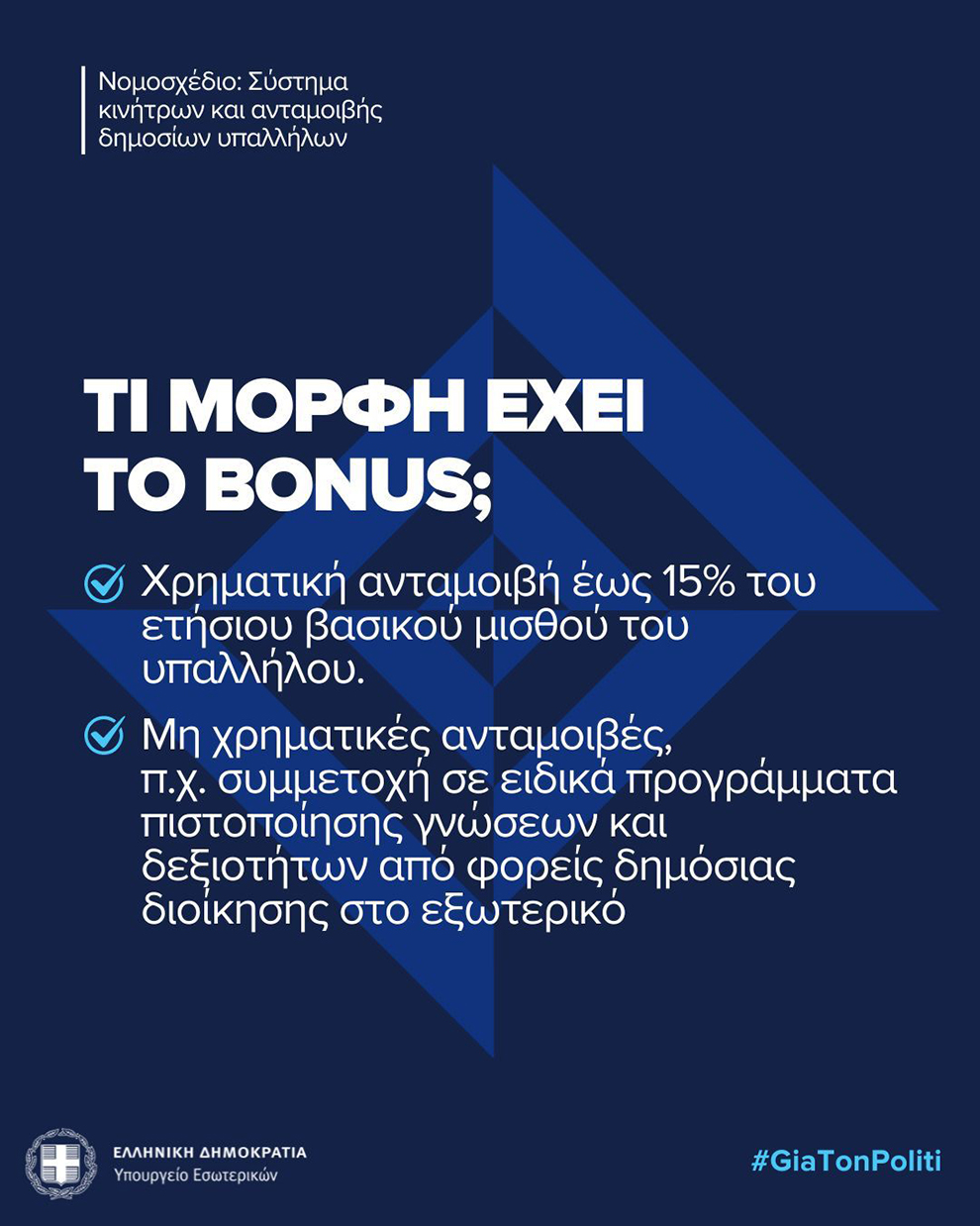 Οι δικαιούχοι υπάλληλοι μπορούν να λάβουν χρηματική ανταμοιβή έως το 15% του ετήσιου βασικού μισθού τους. Η επιλογή των δικαιούχων υπαλλήλων και του ύψους ανταμοιβής ανά δικαιούχο πραγματοποιείται από τους υπηρεσιακούς τους προϊσταμένους και όχι από την πολιτική ηγεσία, με κριτήριο τη συμβολή τους στην επίτευξη των συγκεκριμένων στόχων. Το 40% του ποσού ανταμοιβής κατανέμεται ισομερώς στους δικαιούχους υπαλλήλους που εργάστηκαν για την επίτευξη του στόχου και το 60% κατανέμεται μη οριζόντια και σε συνάρτηση με τη συγκεκριμένη προσφορά του κάθε υπαλλήλου στην επίτευξη του στόχου. Με το νομοσχέδιο προβλέπονται, επίσης, δικλείδες ασφαλείας, για να μην μετατρέπεται το μπόνους σε οριζόντιο επίδομα, ενώ εισάγονται, επίσης, μη χρηματικές ανταμοιβές, οι οποίες μπορούν να έχουν, για παράδειγμα, τη μορφή συμμετοχής σε ειδικά προγράμματα πιστοποίησης γνώσεων και δεξιοτήτων από φορείς δημόσιας διοίκησης στο εξωτερικό.