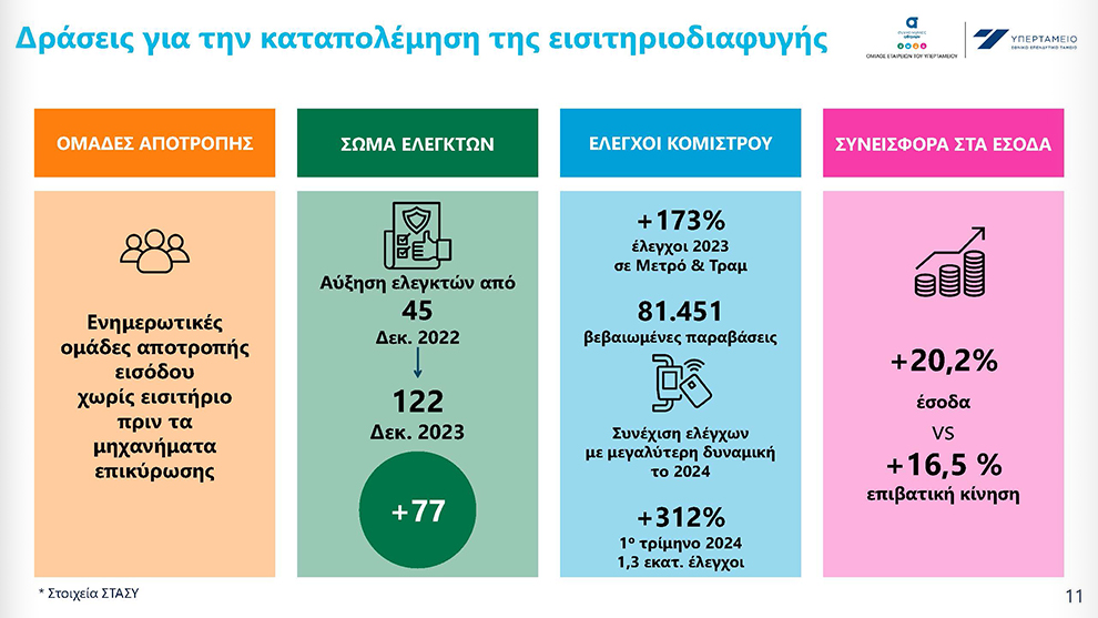 Από την πλευρά του ο διευθύνων σύμβουλος της ΣΤΑΣΥ Θανάσης Κοτταράς, αναφέρθηκε στο πρόγραμμα παρεμβάσεων στους σταθμούς του μετρό ύψους 2,5 εκατ. ευρώ και στο εν εξελίξει έργο αναβάθμισης των 14 συρμών της Γραμμής 1, οι οποίοι θα παραδίδονται τμηματικά μέσα στο 2025. Το έργο θα συμβάλλει στην περαιτέρω μείωση των χρονοαποστάσεων στη Γραμμή 1. «Η Αθήνα αλλάζει, η επισκεψιμότητα της πόλης χρόνο με τον χρόνο μεγαλώνει και καλούμαστε να διαχειριστούμε τα νέα δεδομένα», τόνισε ο κ. Κοτταράς. Παράλληλα παρουσίασε το σχέδιο δράσεων για την αντιμετώπιση της εισιτηριοδιαφυγής στα μέσα σταθερής τροχιάς, που είχε ως αποτέλεσμα (2023) τη σημαντική αύξηση των ελέγχων (κατά 173%), των βεβαιωμένων παραβάσεων (κατά 36%) και των εισπράξεων από τις πωλήσεις κομίστρου (κατά 20,2%).