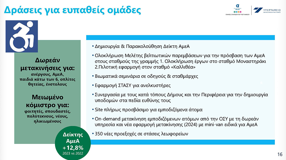 Σημαντική προτεραιότητα είναι και η διασφάλιση της προσβασιμότητας του συγκοινωνιακού συστήματος ισότιμα από όλους τους πολίτες με έμφαση στα ΑμεΑ. Σε αυτό το πλαίσιο έχει ήδη ολοκληρωθεί η μελέτη βελτιωτικών παρεμβάσεων για τον σταθμό της Γραμμής 1 «Καλλιθέα», που θα αποτελέσει πιλότο εφαρμογής και για τους υπόλοιπους σταθμούς της Γραμμής. Ολοκληρώθηκαν τα έργα βελτίωσης της προσβασιμότητας στο σταθμό Μοναστηράκι. Ενεργοποιήθηκε η εφαρμογή της ΣΤΑΣΥ για την ενημέρωση των ΑμεΑ για τους ανελκυστήρες, ενώ θα ολοκληρωθεί εφαρμογή για online ραντεβού δωρεάν μετακίνησης με τα μίνιβαν που χρησιμοποιούν αποκλειστικά οι ΑμεΑ. Τέλος, τοποθετήθηκαν πάνω από 350 προεξοχές σε στάσεις λεωφορείων και επιδιώκεται συστηματική συνεργασία με την τοπική αυτοδιοίκηση για τη δημιουργία των απαραίτητων υποδομών που θα επιτρέπουν να άτομα με αναπηρία να προσεγγίσουν τα ΜΜΜ.