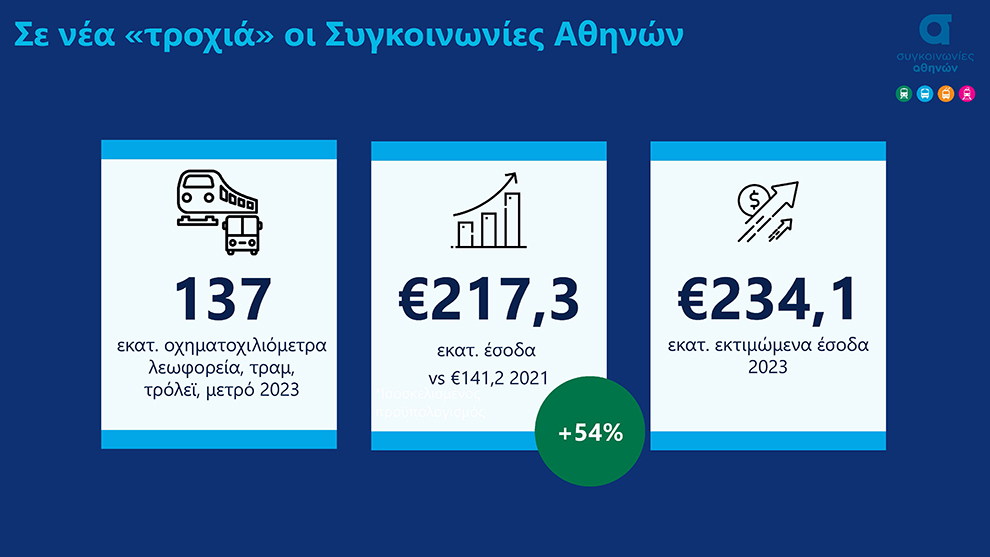 Σύμφωνα με τα στοιχεία που παρουσιάστηκαν, η Αθήνα παρέχει το δεύτερο φθηνότερο εισιτήριο στην ΕΕ. Οι Συγκοινωνίες Αθηνών καταγράφουν πορεία ανόδου στους βασικούς πυλώνες λειτουργίας τους, υπό τον κεντρικό σχεδιασμό του υπουργείου Υποδομών και Μεταφορών, με τη δημιουργία ενός προηγμένου μοντέλου διακυβέρνησης του Ομίλου να αποτελεί προτεραιότητα, καθώς επιδιώκεται η αξιοποίηση της γνώσης και των δεξιοτήτων των ανθρώπων του.