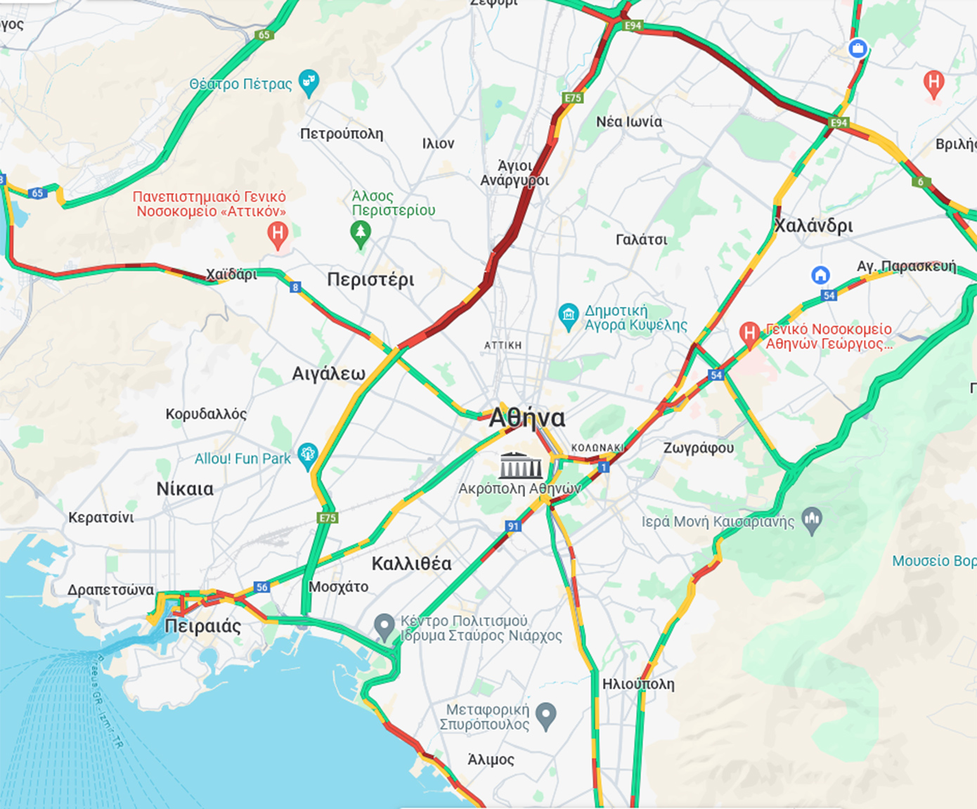 Πιο συγκεκριμένα μεγάλες δυσκολίες αντιμετωπίζουν οι οδηγοί στη λεωφόρο Κηφισού, με την κίνηση να είναι αρκετά αυξημένη στο ρεύμα της ανόδου, από το ύψος του Περιστερίου μέχρι τους Αγίους Αναργύρους.