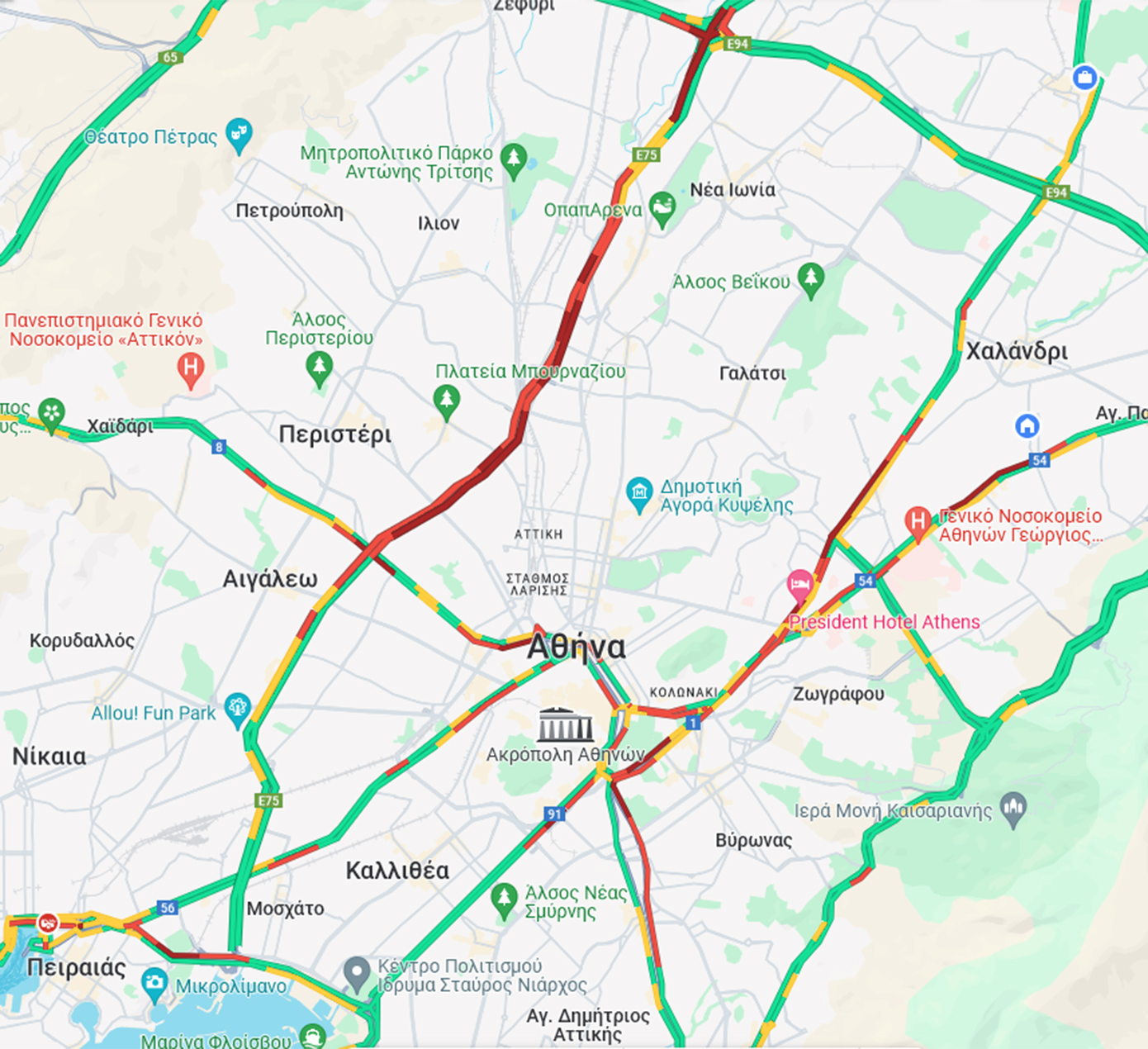 Όλοι οι δρόμοι στο κέντρο της Αθήνας είναι στο «κόκκινο», ενώ αυξημένη κίνηση παρατηρείται και στη Λεωφόρο Κηφισίας.