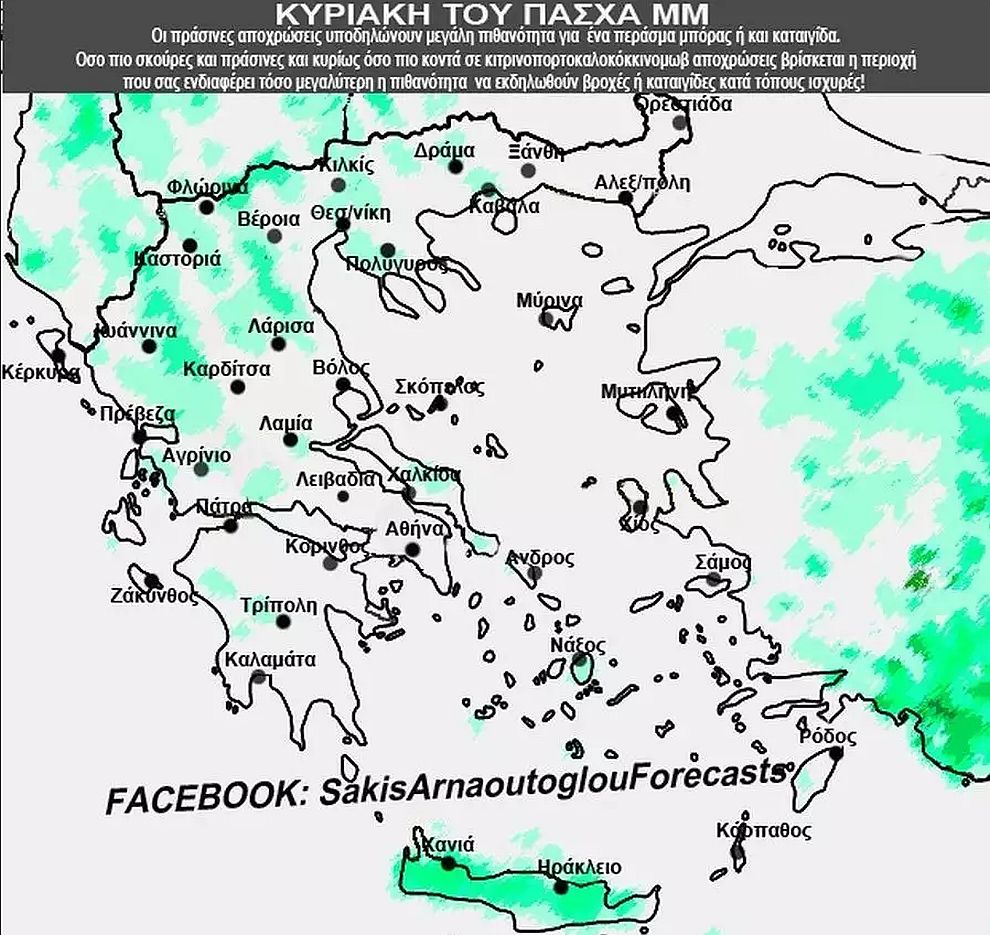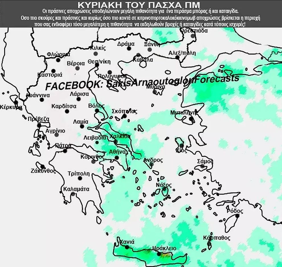 Το πρωί της Κυριακής του Πάσχα οι ίδιες περιοχές έχουν αρκετά μεγάλη πιθανότητα να δώσουν φαινόμενα, ενώ στην υπόλοιπη χώρα ο καιρός αναμένεται πολύ καλύτερος. Ωστόσο, τις απογευματινές ώρες φαινόμενα αναμένονται στα ηπειρωτικά της Βόρειας και Δυτικής Ελλάδας.