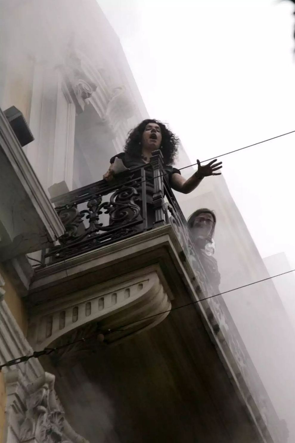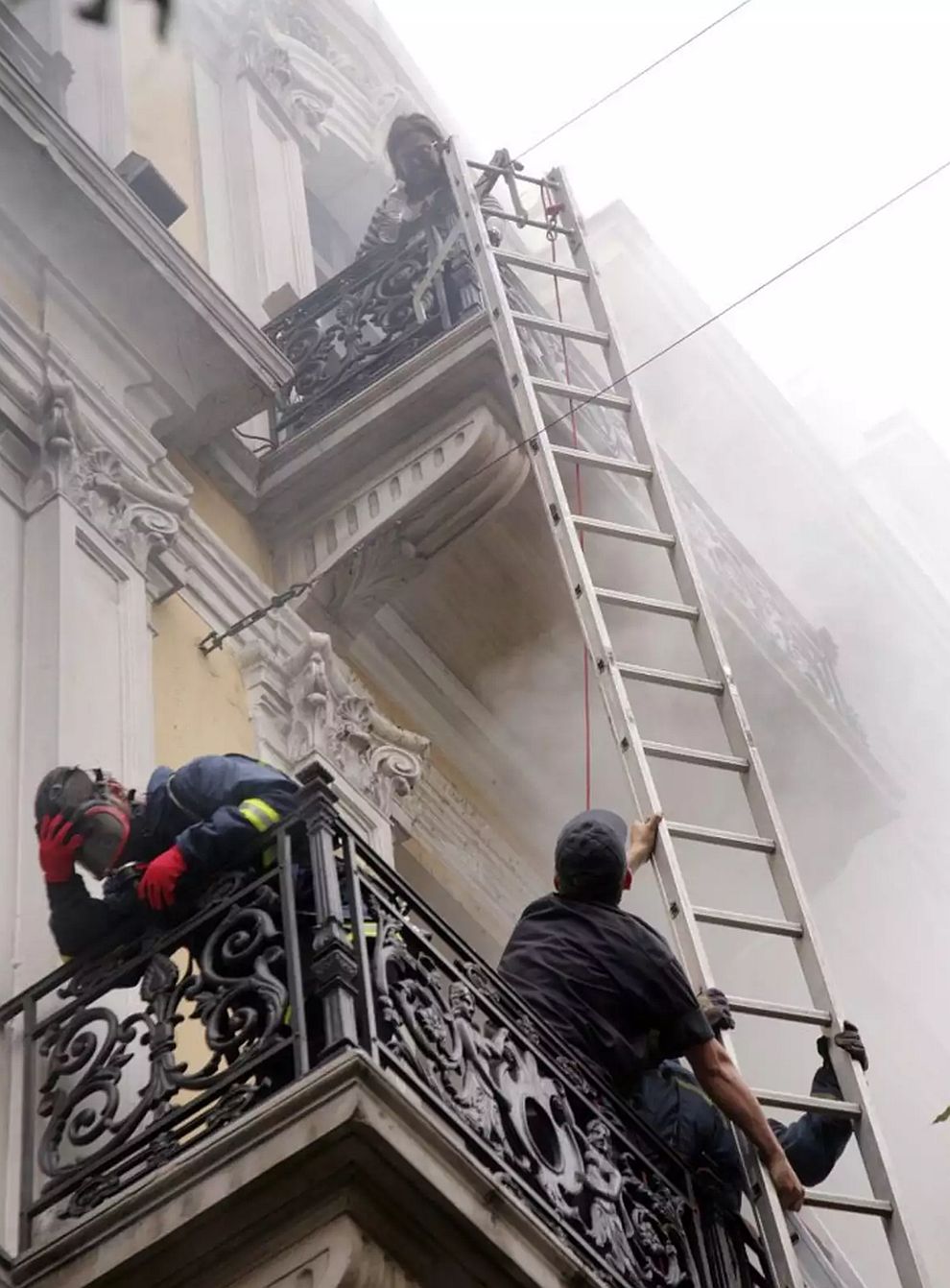 Μερικοί εργαζόμενοι καταφεύγουν στο μπαλκόνι του δεύτερου ορόφου, εκ των οποίων κάποιοι πατώντας στο περβάζι και σκαρφαλώνοντας καταφέρνουν να φτάσουν στο όμορο κτήριο που στεγάζεται το κατάστημα «Στρογγυλός». Ένας πηδάει σε διπλανό σκέπαστρο το οποίο καταρρέει και καταλήγει σε ένα τσιμεντένιο σκέπαστρο με αποτέλεσμα να τραυματιστεί στα πλευρά, ενώ τρεις διασώζονται με σκάλες της Πυροσβεστικής.