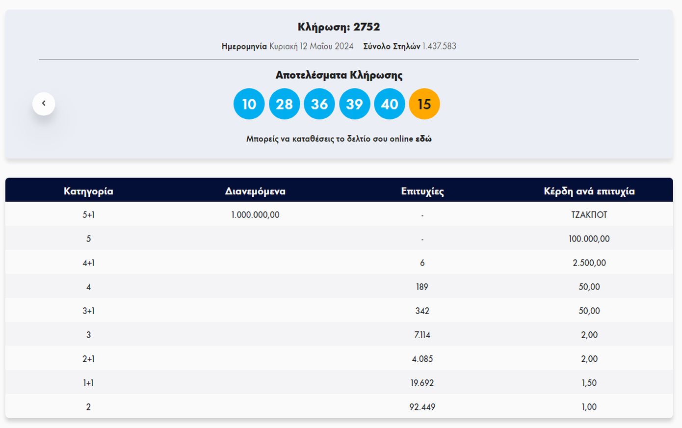 Οι τυχεροί αριθμοί λοιπόν, στη σημερινή κλήρωση Τζόκερ είναι οι εξής: 10, 28, 36, 39, 40 και Τζόκερ ο αριθμός: 15.