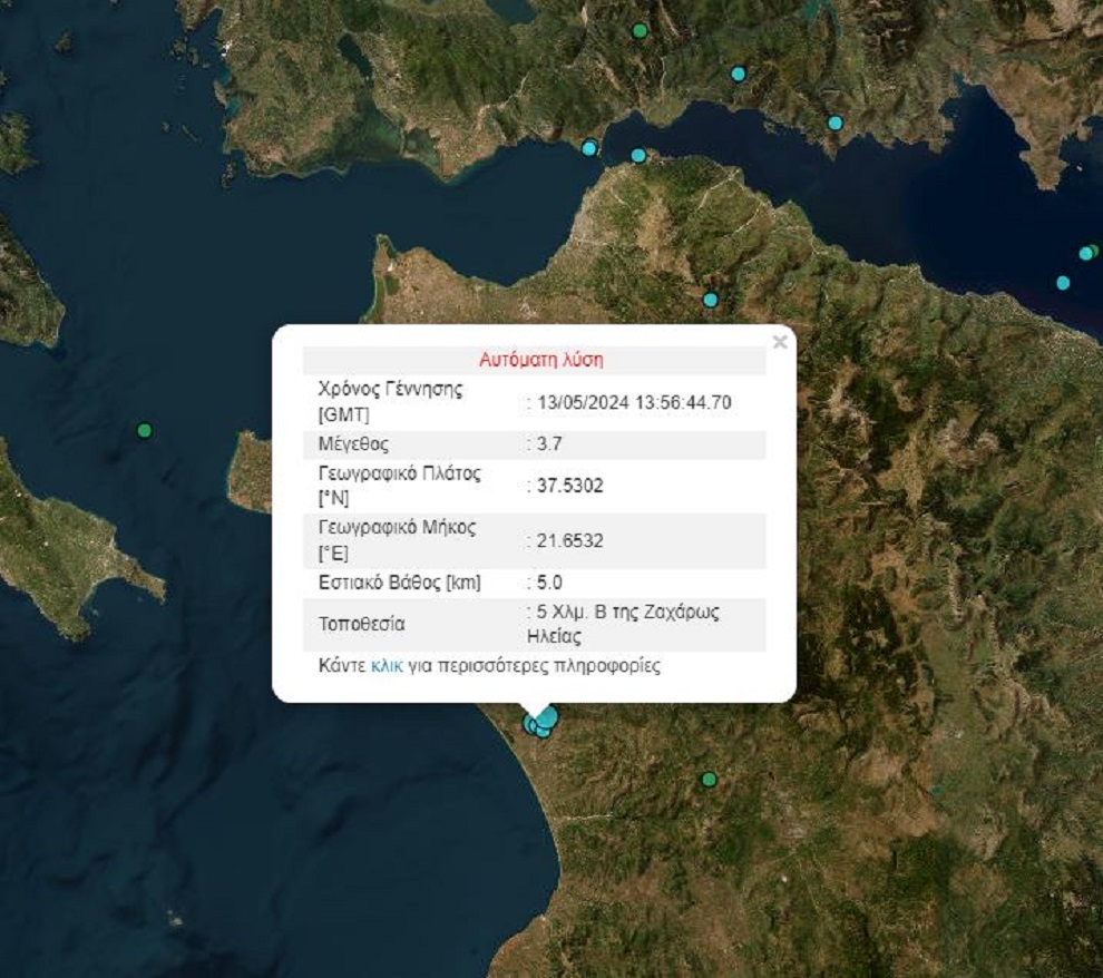 Σεισμός σημειώθηκε το μεσημέρι της Δευτέρας (13/5) στην Ηλεία και συγκεκριμένα ήταν μεγέθους 3,7 Ρίχτερ.