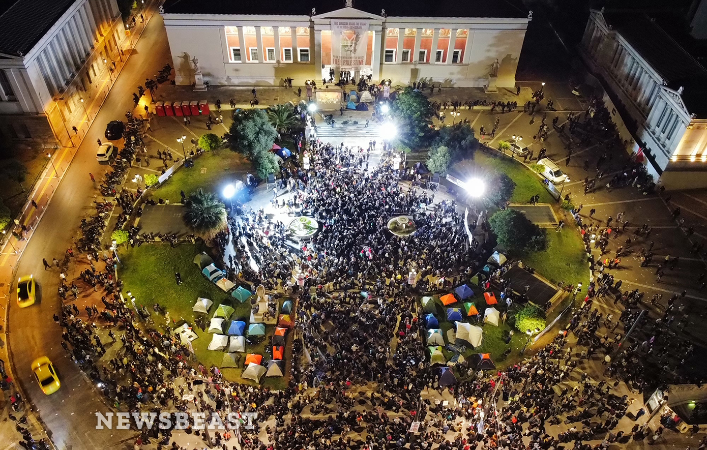Οι φοιτητές άρχισαν να συγκεντρώνονται έξω από τα Προπύλαια λίγο μετά τις 20:00 το βράδυ και σκοπεύουν να παραμείνουν εκεί μέχρι το πρωί της Τρίτης.