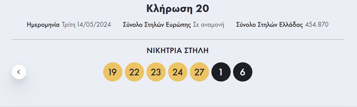 Οι τυχεροί αριθμοί είναι οι εξής: 19, 22, 23, 24, 27 και 1, 6
