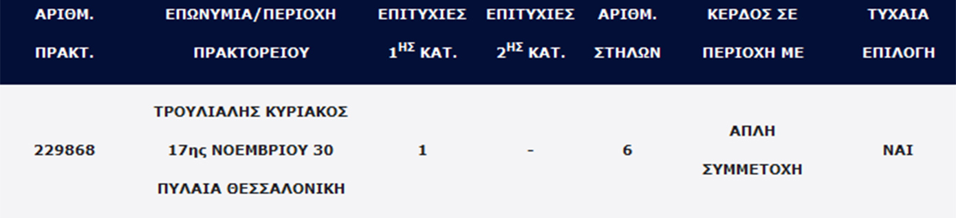 Όπως ανακοινώθηκε από τον ΟΠΑΠ, το δελτίο συμπληρώθηκε στην περιοχή της Πυλαίας και είχε κόστος 3 ευρώ (6 στήλες).