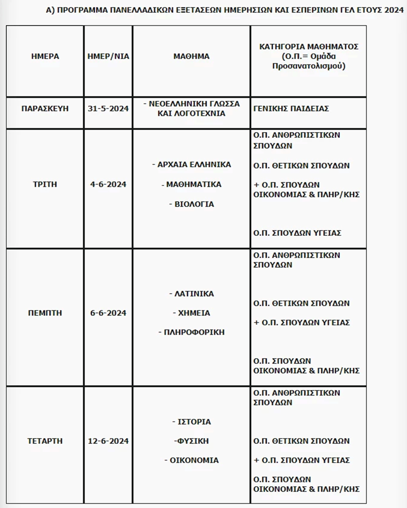 Το πρόγραμμα των φετινών πανελλαδικών εξετάσεων 2024
