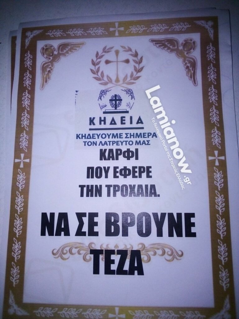 «Κηδεύουμε σήμερα το λατρευτό μας καρφί που έφερε την τροχαία. Να σε βρούνε τέζα», έγραφε επάνω στο κηδειόχαρτο.