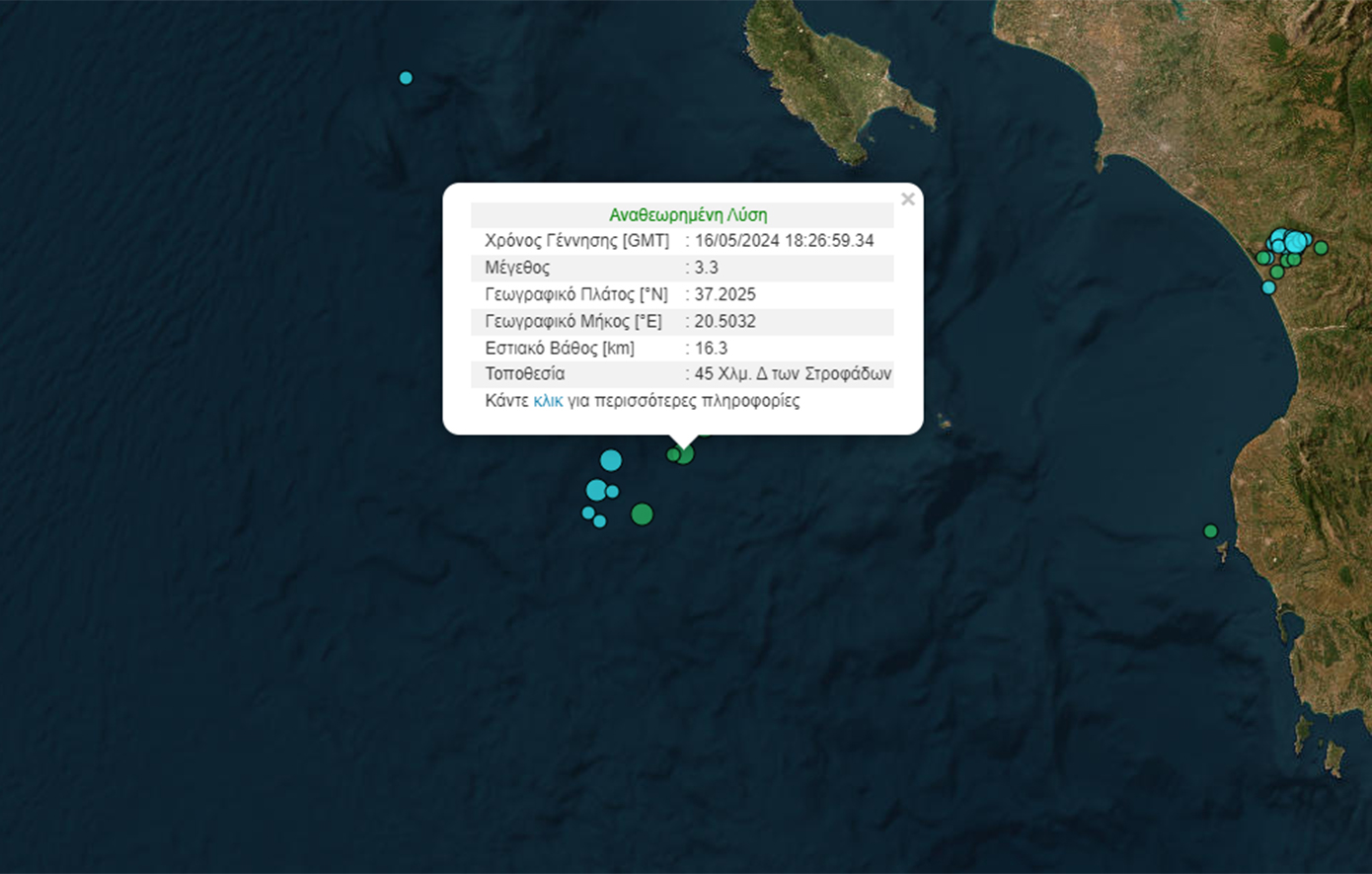 Σύμφωνα με το Γεωδυναμικό Ινστιτούτο, το επίκεντρο του σεισμού εντοπίζεται 45 χιλιόμετρα δυτικά των Στροφάδων.