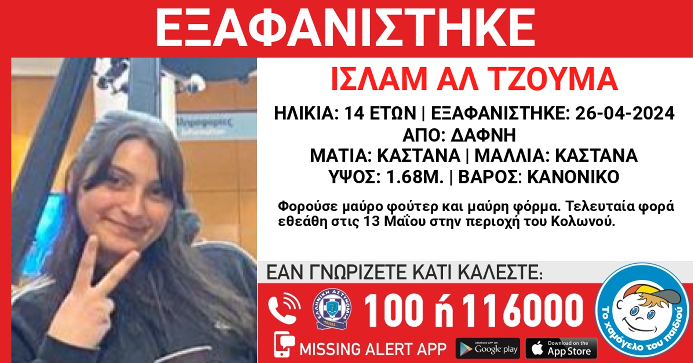 Τελευταία φόρα εθεάθη στις 13/05/2024 απογευματινές ώρες στην περιοχή του Κολωνού. Το «Χαμόγελο του Παιδιού» ενημερώθηκε για την εξαφάνιση της ανήλικης και προχώρησε στην δημοσιοποίηση των στοιχείων της, καθώς συντρέχουν λόγοι που θέτουν της ζωή της σε κίνδυνο. Η Iσλάμ (ον.) Aλ Τζουμά (επ.), έχει ύψος 1,68 μ. και κανονικό βάρος, έχει καστανά μαλλιά και καστανά μάτια. Την ημέρα που εξαφανίστηκε φορούσε μαύρο φούτερ και μαύρη φόρμα.