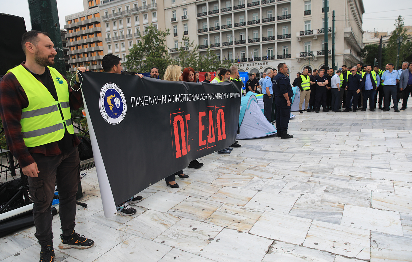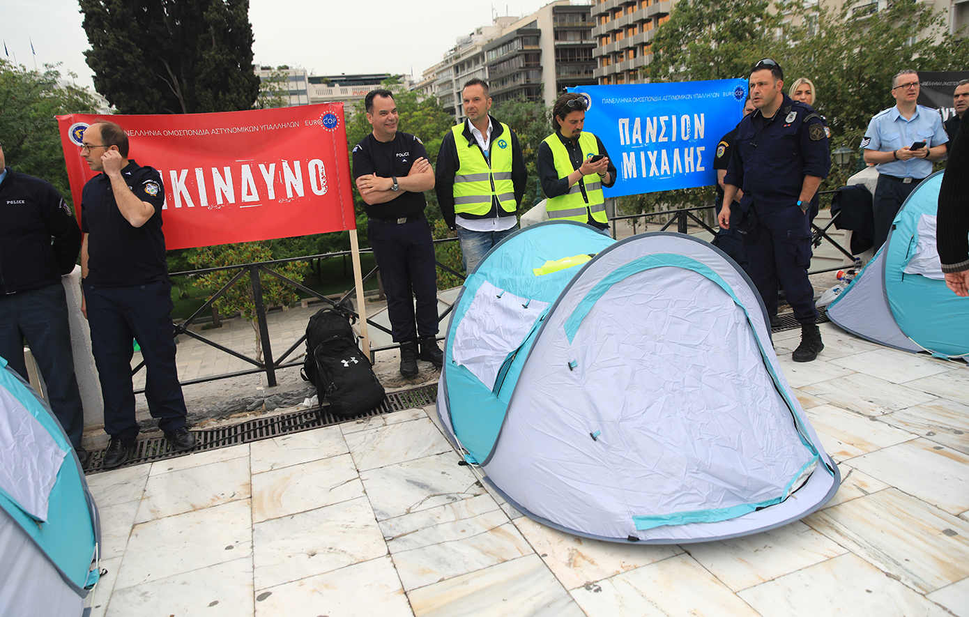 Συγκέντρωση διαμαρτυρίας στο Σύνταγμα πραγματοποιούν σήμερα, Παρασκευή 17/5 αστυνομικοί οι οποίοι καταγγέλλουν φτωχοποίηση της αστυνομίας. Οι ένστολοι έχουν στήσει σκηνές απέναντι από τη Βουλή και σε πανό το οποίο κρατούν γράφουν «ΩΣ ΕΔΩ».