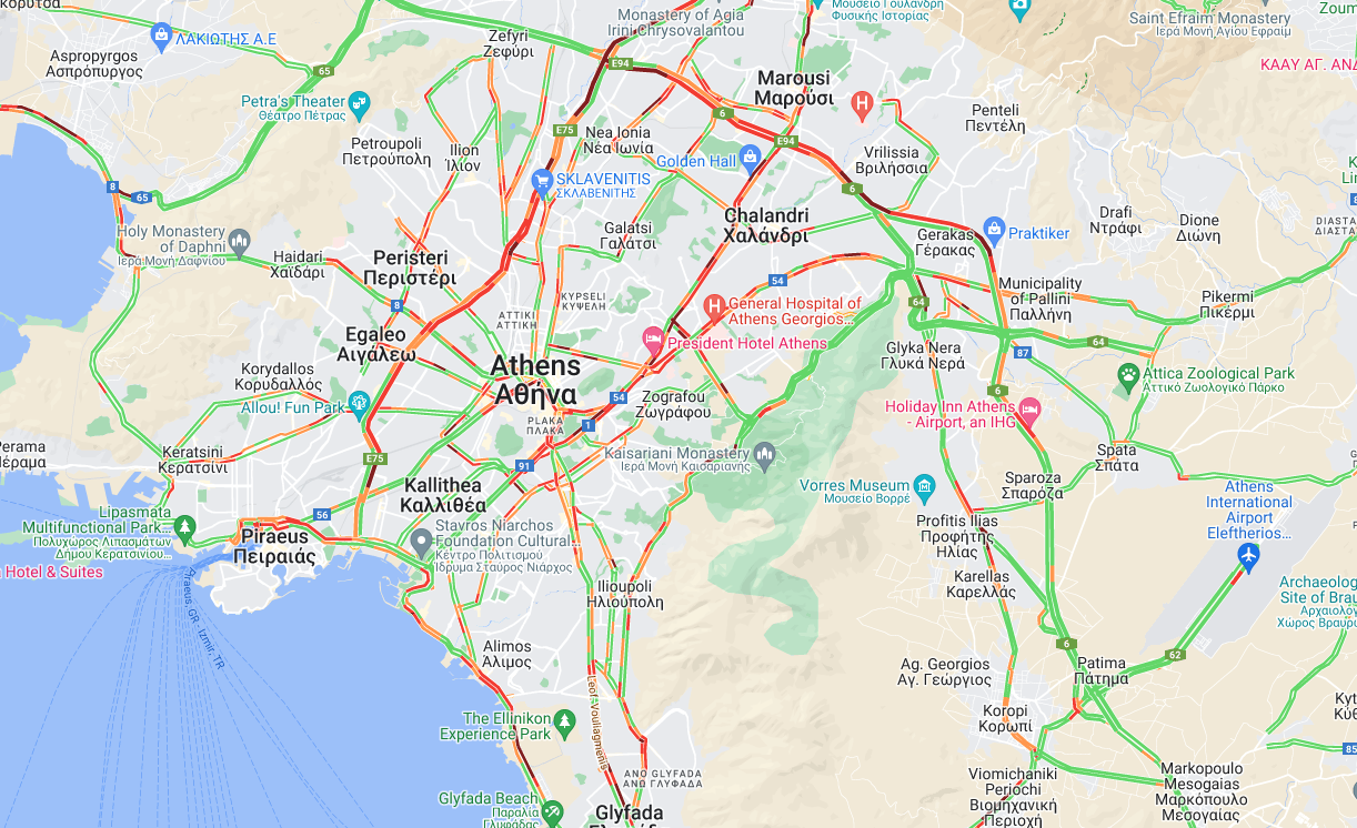 Χάος επικρατεί στις εθνικές οδούς και σε άλλες βασικές οδικές αρτηρίες της Αθήνας, καθώς εντοπίζονται σημαντικά κυκλοφοριακά προβλήματα το απόγευμα της Παρασκευής.