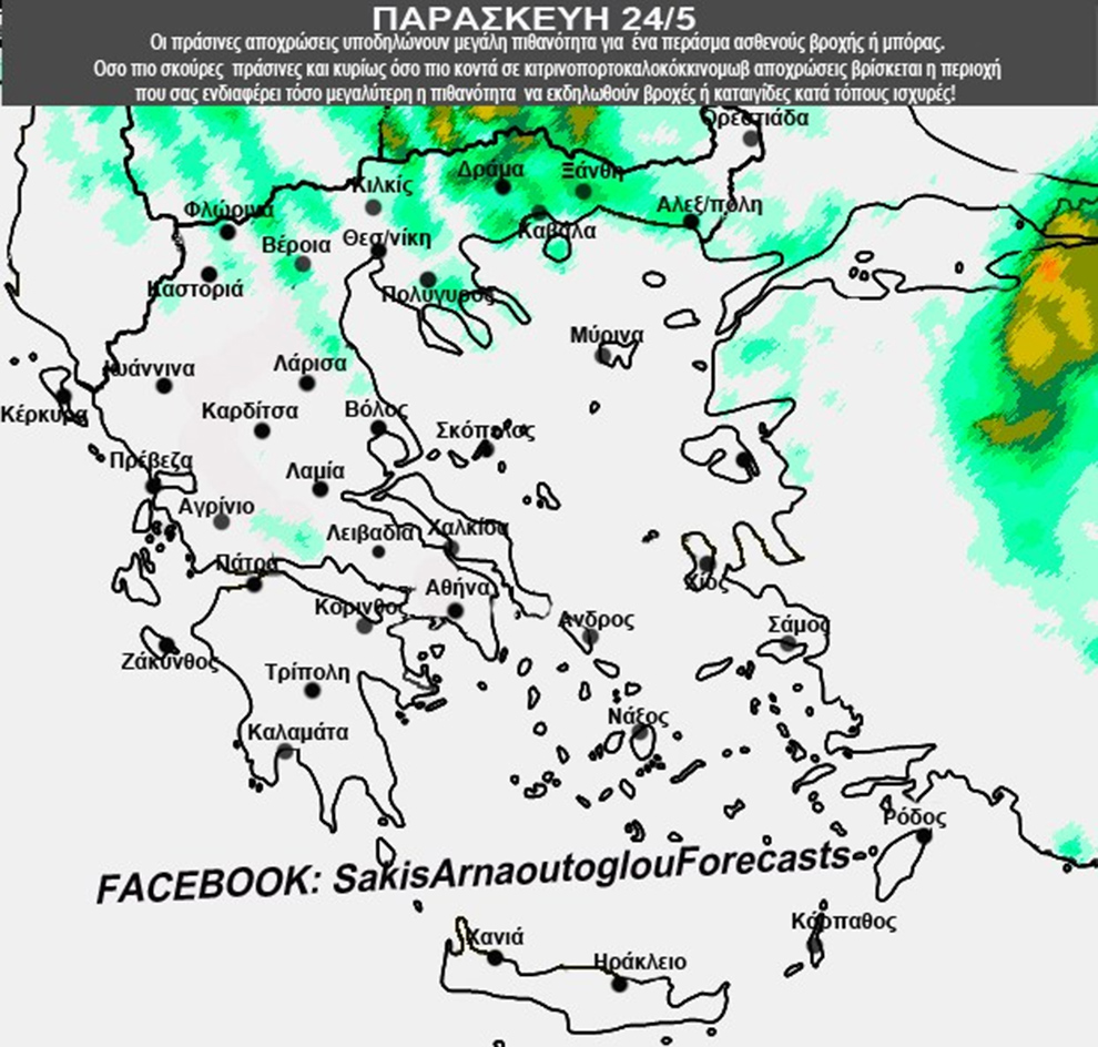 O Σάκης Αρναούτογλου ανήρτησε στο Facebook χάρτες, επισημαίνοντας τις περιοχές με φαινόμενα από την Παρασκευή 24/5 έως και την Κυριακή 26/5.