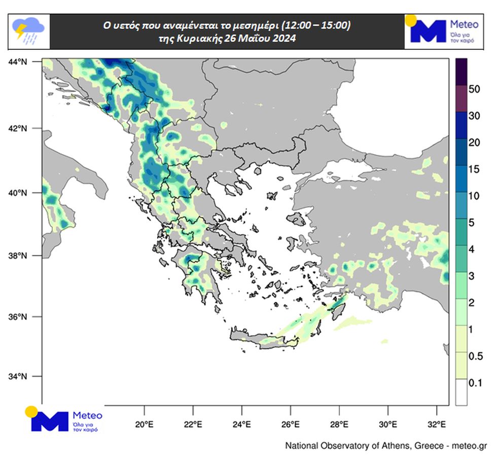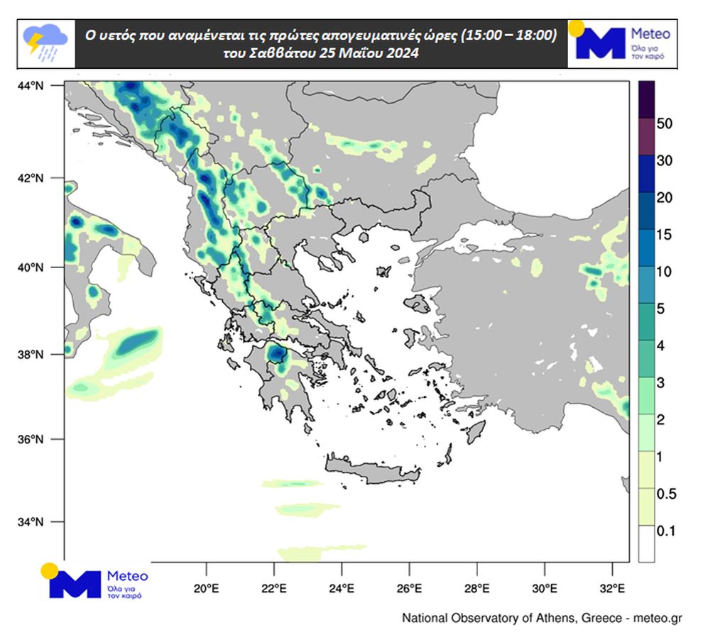 Στους χάρτες που ακολουθούν παρουσιάζεται ενδεικτικά ο υετός που αναμένεται τις πρώτες απογευματινές ώρες του Σαββάτου 25/05 και το μεσημέρι της Κυριακής 26/05.