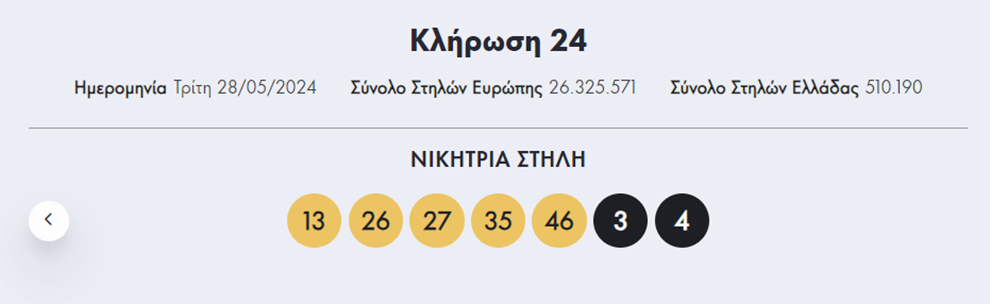 Οι τυχεροί αριθμοί είναι οι εξής: 13, 26, 27, 35, 46 και 3, 4.