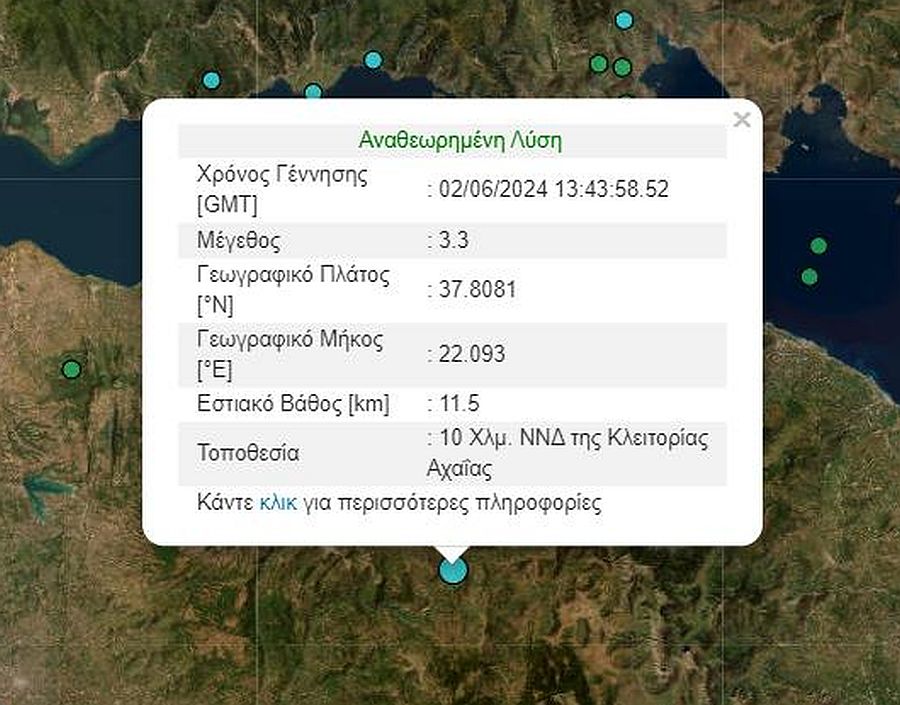 Σύμφωνα με το Γεωδυναμικό Ινστιτούτο του Εθνικού Αστεροσκοπείου Αθηνών, η δόνηση ήταν μεγέθους 3,3 βαθμών της κλίμακας Ρίχτερ και σημειώθηκε 10 χιλιόμετρα νότια νοτιοδυτικά της Κλειτορίας Αχαΐας. Το εστιακό βάθος υπολογίζεται στα 11,5 χιλιόμετρα.