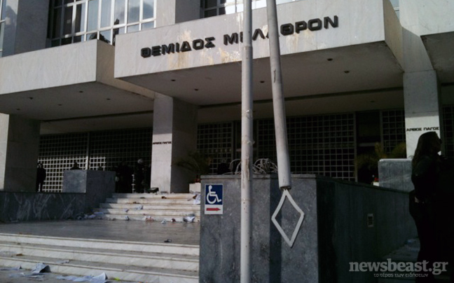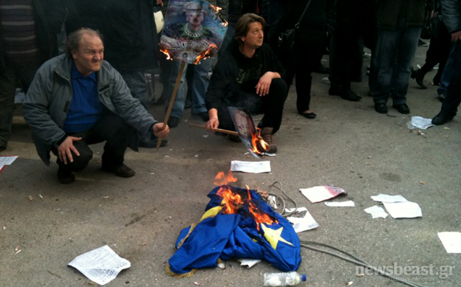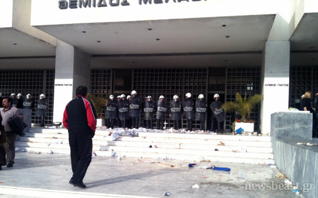 Οργισμένοι συμβασιούχοι ανεβαίνουν στο κοντάρι απ’ όπου κρέμεται η σημαία της Ευρωπαϊκής Ένωσης, την κατεβάζουν και την καίνε. Είχαν προηγηθεί μικρής έκτασης επεισόδια, με τους συγκεντρωμένους να πετάνε καφέδες, νερά και αυγά εναντίον αστυνομικών, αλλά και στην πρόσοψη του κτιρίου του Αρείου Πάγου, αμέσως μόλις έμαθαν πως και η πρόταση του εισαγγελέα Ιωάννη Τέντε -εκτός του εισηγητή- ήταν απορριπτική.