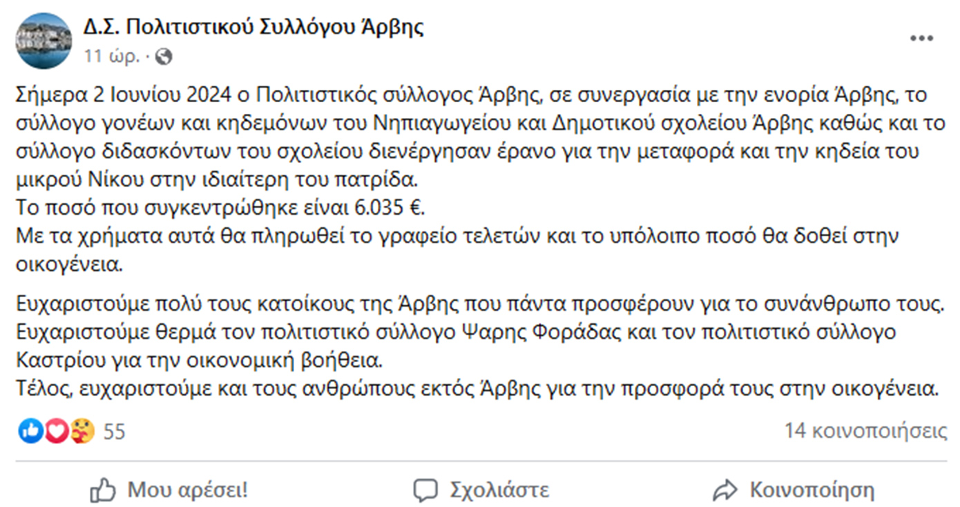 Ήδη, όπως ανακοίνωσε ο Πολιτιστικός – Εξωραϊστικός Σύλλογος της Άρβης, από τον έρανο συγκεντρώθηκε το χρηματικό ποσό των 6.035 ευρώ.