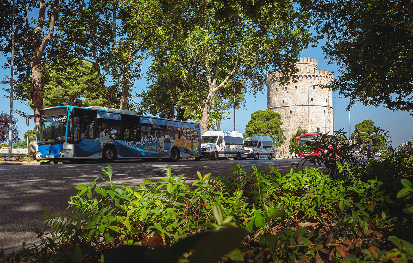 Φτερά… στις ρόδες του έχει βάλει το λεωφορείο του ΟΑΣΘ που είναι ντυμένο διαφορετικά από όλα τα άλλα και εκτελεί την Πολιτιστική Γραμμή 50 του οργανισμού. O αριθμός του δηλώνει τα ακριβή λεπτά που χρειάζονται ώστε αυτό να ξεναγήσει τους επισκέπτες στην πόλη σε όλα τα σημαντικά μνημεία. Οι Έλληνες και ξένοι τουρίστες που επισκέπτονται τη Θεσσαλονίκη, όχι μόνο του δίνουν ψήφο εμπιστοσύνης με ολοένα και μεγαλύτερη ένταση, αλλά εκδηλώνουν και συναισθήματα θαυμασμού και χαράς σε όλη τη διαδρομή, ιδίως όταν αυτό παίρνει τη στροφή στην Πορτάρα και κατευθύνεται προς την πλατεία Αναργύρων.