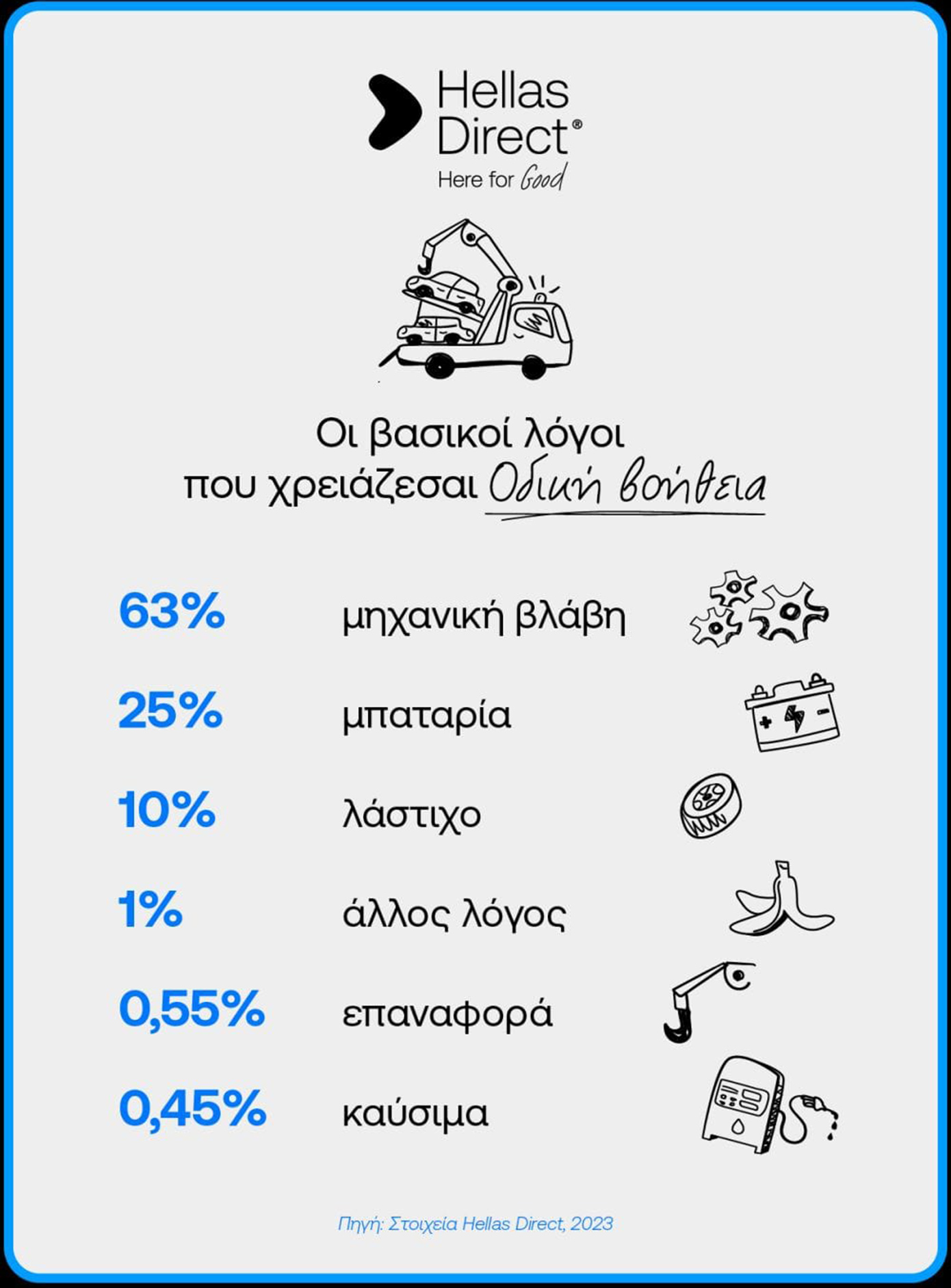 Ο βασικότερος λόγος για τους οποίους μπορεί να «προδώσει» το αυτοκίνητο τον οδηγό του είναι η μηχανική βλάβη. 6 από τις 10 κλήσεις (63%) που έλαβε η ομάδα της Hellas Direct για οδική βοήθεια το 2023 ήταν γι’ αυτόν τον λόγο. Δυστυχώς, σε μία τέτοια περίπτωση δεν υπάρχει κάτι που μπορείς να κάνεις μόνος σου και η μόνη λύση είναι να ζητήσεις βοήθεια.