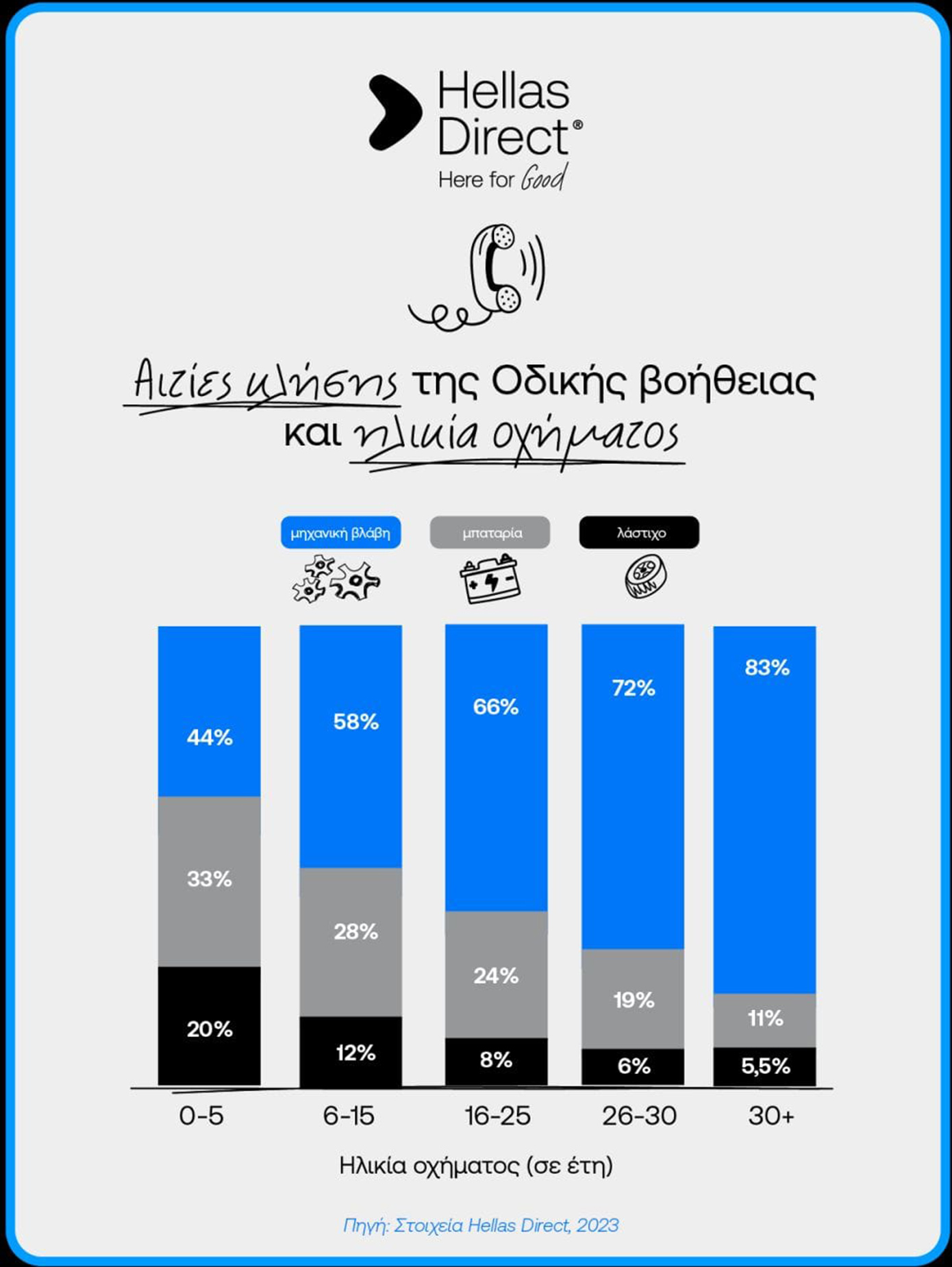 Όπως είναι φυσικό, όσο μεγαλύτερης ηλικίας είναι ένα όχημα, τόσο πιο πιθανό είναι να οδηγήσει τον κάτοχο του σε αναζήτηση βοήθειας λόγω μηχανικής βλάβης. Αυτό ακριβώς αποτυπώνεται και στις κλήσεις Οδικής βοήθειας. Πιο συγκεκριμένα, από όλες τις κλήσεις για οδική βοήθεια που έλαβε η ομάδα της Hellas Direct για το 2023 και αφορούσαν οχήματα έως 5 ετών, η μηχανική βλάβη ήταν η αιτία για το 44%. Το ποσοστό αυτό έγινε 58% στα οχήματα 6-15 ετών, 66% στα οχήματα 16-25 ετών, 72% στις ηλικίες 26-30 ετών και τερμάτισε στο 83% στα οχήματα άνω των 30 ετών.