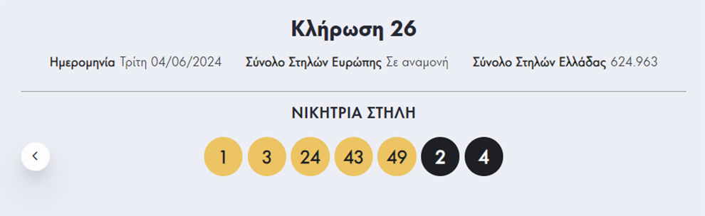 Οι τυχεροί αριθμοί είναι οι εξής: 1, 3, 24, 43, 49 και 2,4