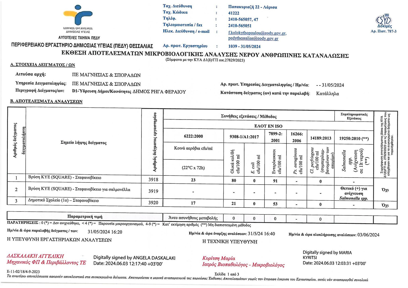 Οι εκθέσεις των εργαστηριακών ελέγχων που πραγματοποιήθηκαν στις 31 Μαΐου από τον ΕΟΔΥ δόθηκαν στον δήμο Ρήγα Φεραίου. Σύμφωνα με τα αρχεία, η υπηρεσία της διεύθυνσης Υγείας της Περιφέρειας Θεσσαλίας, γνωστοποίησε επανειλημμένως τις επανορθωτικές ενέργειες που θα πρέπει να κάνει ο δήμος.