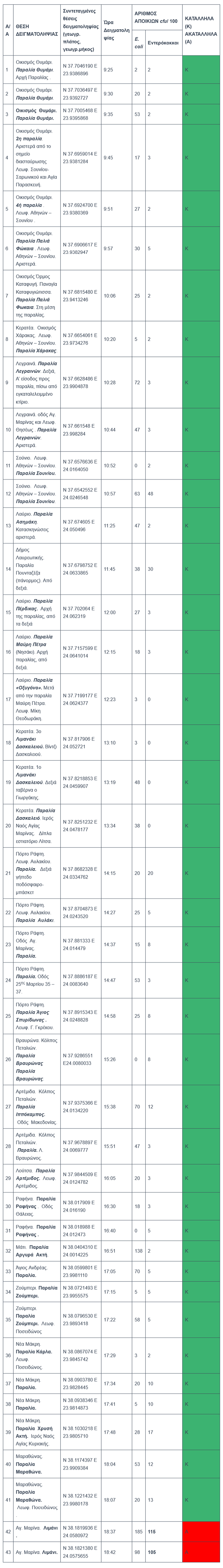 Σε νέο δελτίο Τύπου του ΠΑΚΟΕ παρουσιάζεται ο πίνακας των αποτελεσμάτων από τις ακτές της Ανατολικής Αττικής, από παραλία Θυμάρι μέχρι Αγία Μαρίνα, μαζί με χάρτες. Από τα 43 δείγματα που εξετάστηκαν τα δύο (2), δηλαδή 4,65%, βρέθηκαν ακατάλληλα (Α) για κολύμβηση, ενώ τα σαράντα ένα (41), δηλαδή 95,35%, βρέθηκαν κατάλληλα (Κ) για κολύμβηση.