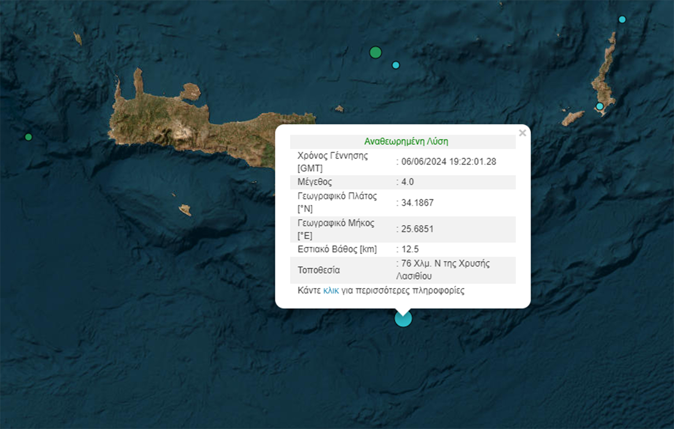 Το επίκεντρο του σεισμού εντοπίστηκε 76 χιλιόμετρα νότια της Χρυσής Λασιθίου ενώ το εστιακό βάθος υπολογίζεται στα 10χλμ.