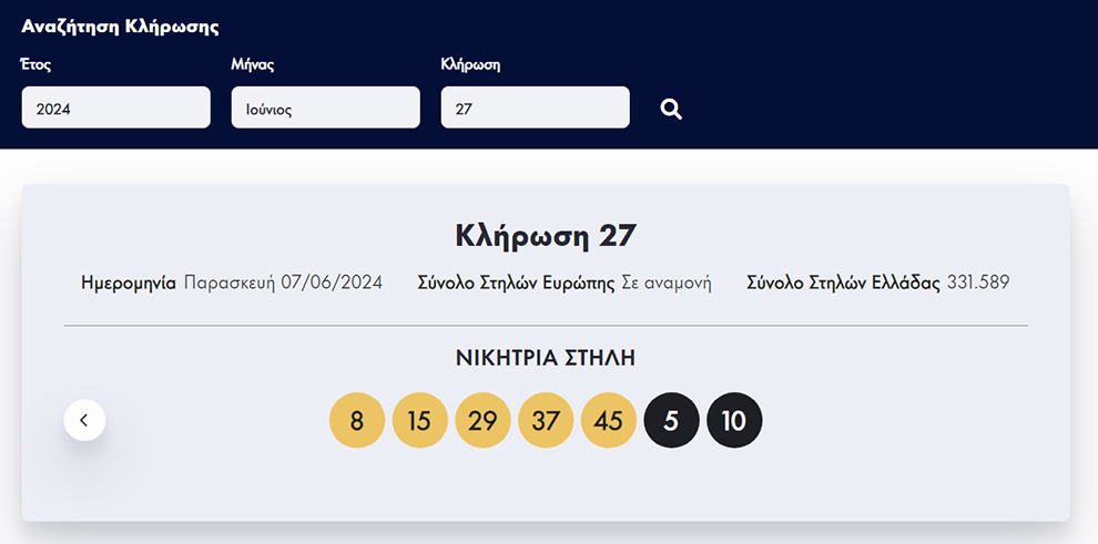 Οι τυχεροί αριθμοί στη σημερινή κλήρωση είναι οι εξής: 8, 15, 29, 37, 45 και 5, 10.