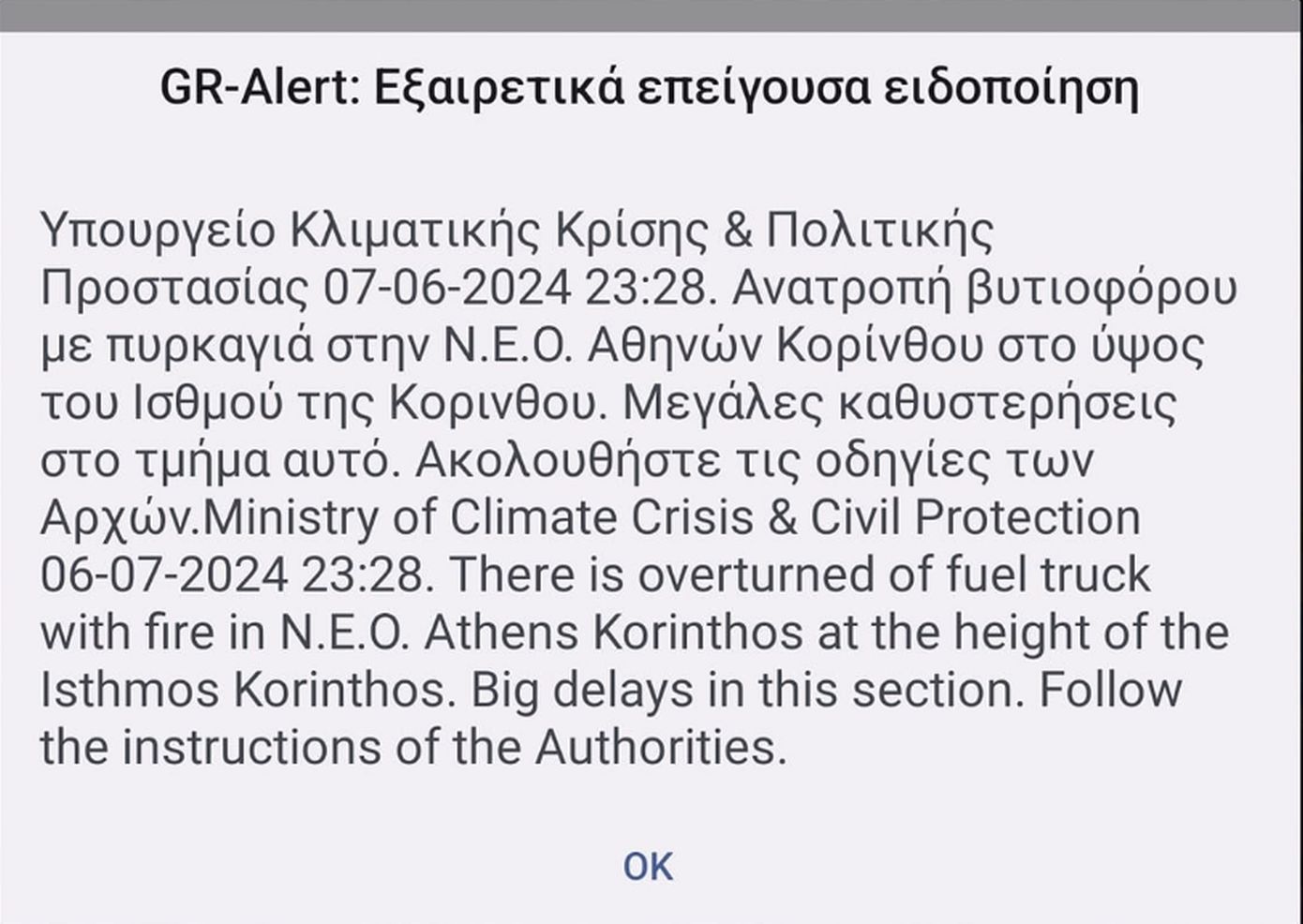 Εστάλη μήνυμα από το 112 σε κατοίκους ορισμένων περιοχών το οποίο ενημερώνει τους οδηγούς για την ύπαρξη της φωτιάς καθώς και για τις μεγάλες καθυστερήσεις που σημειώνονται.