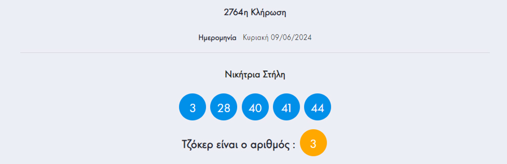 Οι τυχεροί αριθμοί λοιπόν, στη σημερινή κλήρωση Τζόκερ είναι οι εξής: 3, 28, 40, 41, 44 και Τζόκερ ο αριθμός 3.