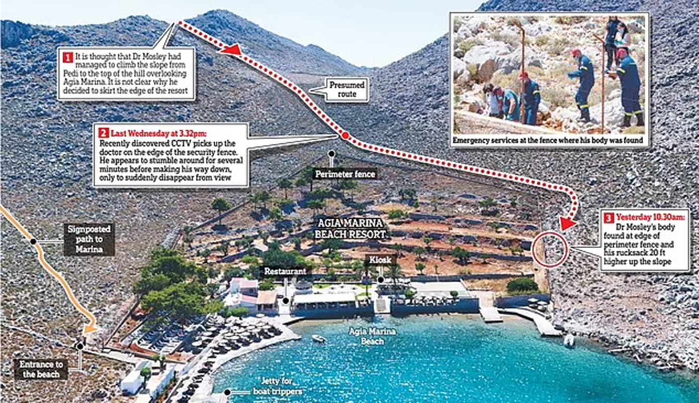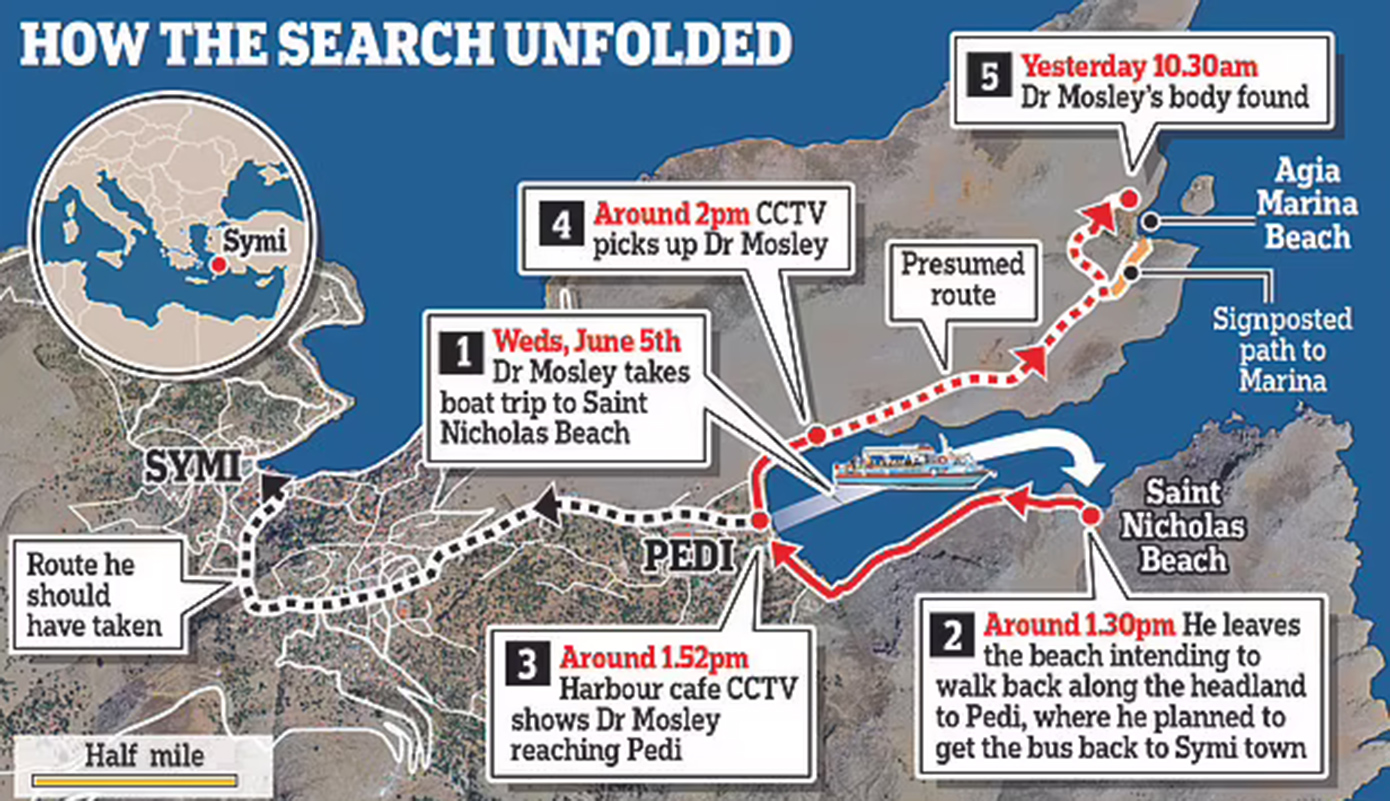 Ο ιατροδικαστής που βρέθηκε στη Σύμη λίγο μετά τον εντοπισμό του Μάικλ Μόσλεϊ το πρωί της Κυριακής (9/6) και εξέτασε το σώμα του απέκλεισε την εγκληματική ενέργεια, χωρίς να μπορέσει να διαπιστώσει περισσότερα, λόγω του ότι το πτώμα βρισκόταν σε προχωρημένη σήψη.