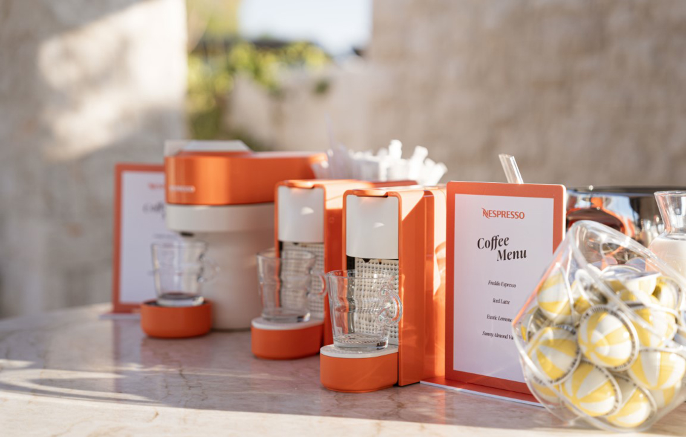 Στη συλλογή Unforgettable Mediterranean Summer, η Nespresso παρουσίασε παγωμένα ροφήματα καφέ με πρωταγωνιστές τα αγαπημένο μας freddo espresso και freddo cappuccino για ένα αξέχαστο μεσογειακό καλοκαίρι. Για τα αξεσουάρ εμπιστεύθηκε τους ειδικούς του χρώματος στο Pantone Color Institute για να δημιουργήσουν μια χρωματική παλέτα από τις εμβληματικές μεσογειακές παραθαλάσσιες πόλεις, με πρωταγωνιστή τη μοναδική απόχρωση Mandarin Orange.