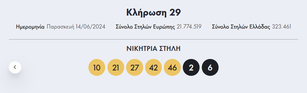 Οι τυχεροί αριθμοί είναι οι εξής: 10, 21, 27, 42, 46 και 2, 6