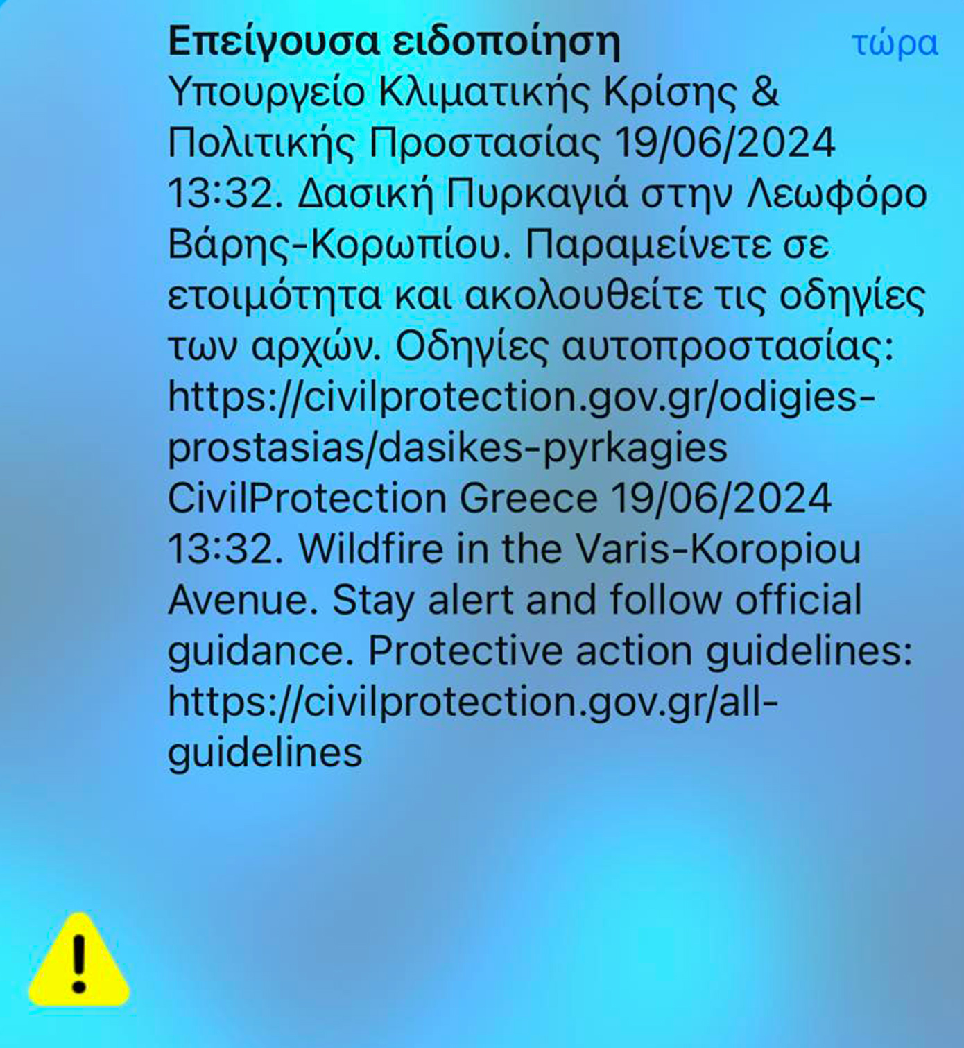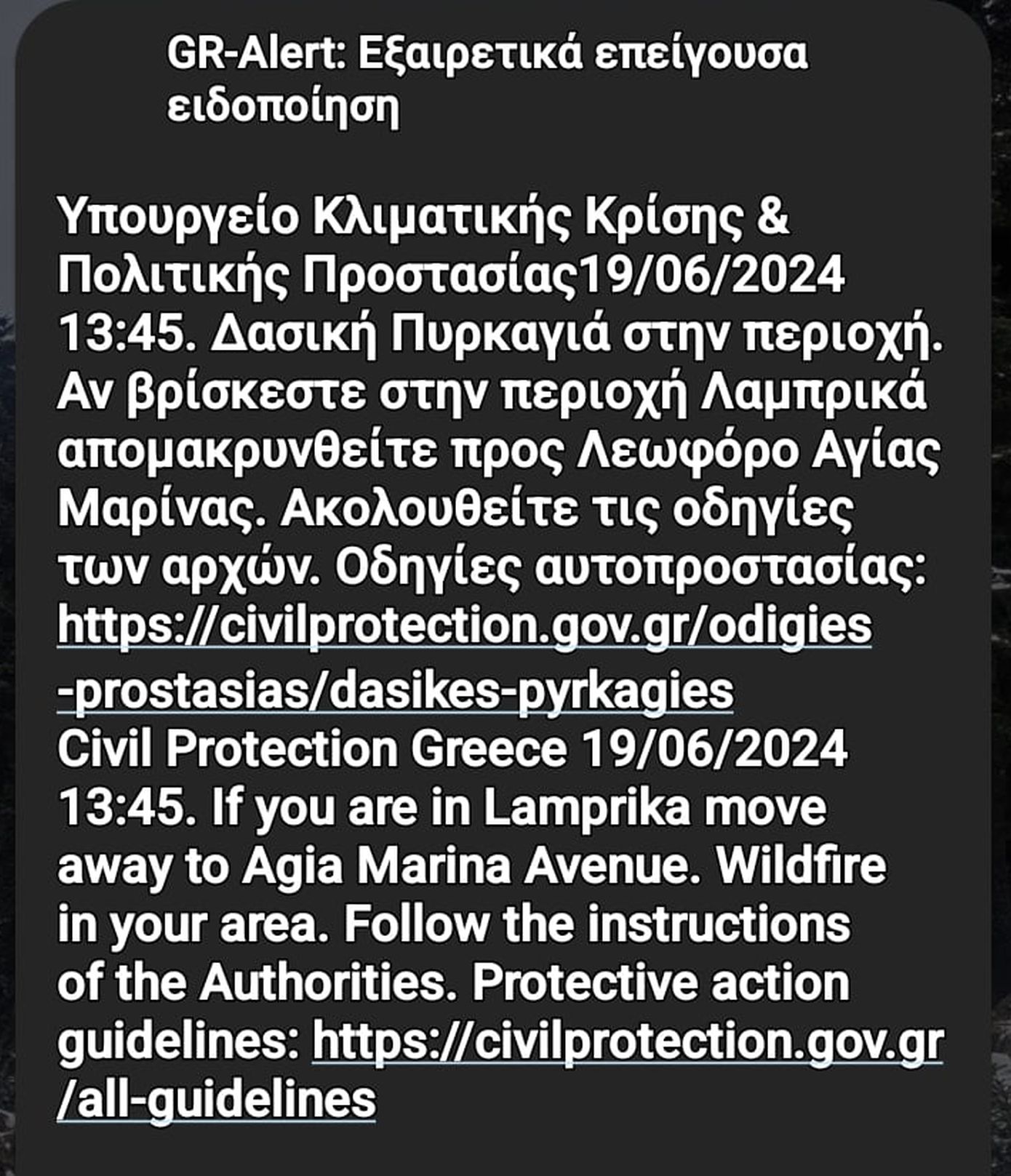 «Δασική πυρκαγιά στην Αττική. Αν βρίσκεστε στην περιοχή Λαμπρικά, απομακρυνθείτε προς Λεωφόρο Αγίας Μαρίνας», αναφέρει ένα δεύτερο μήνυμα του 112.