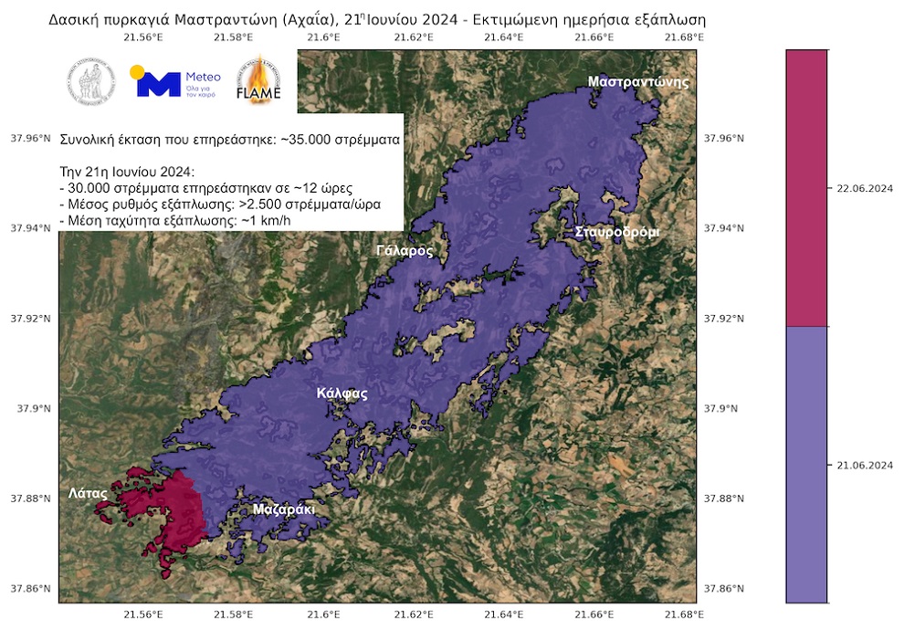Αξίζει να σημειωθεί ότι στο παραπάνω χρονικό διάστημα (21.06.2024, – 15:00 με 23:59), ο εκτιμώμενος μέσος ρυθμός εξάπλωσης της πυρκαγιάς εκτιμάται μεγαλύτερος των 2.500 στρεμμάτων ανά ώρα.