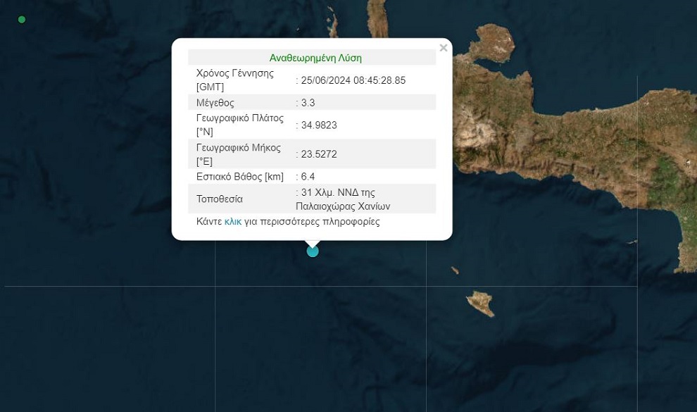 Πιο συγκεκριμένα η δόνηση 3,3 βαθμών της κλίμακας Ρίχτερ είχε επίκεντρο 31 χιλιόμετρα νοτιοδυτικά της Παλάιοχώρας Χανίων.