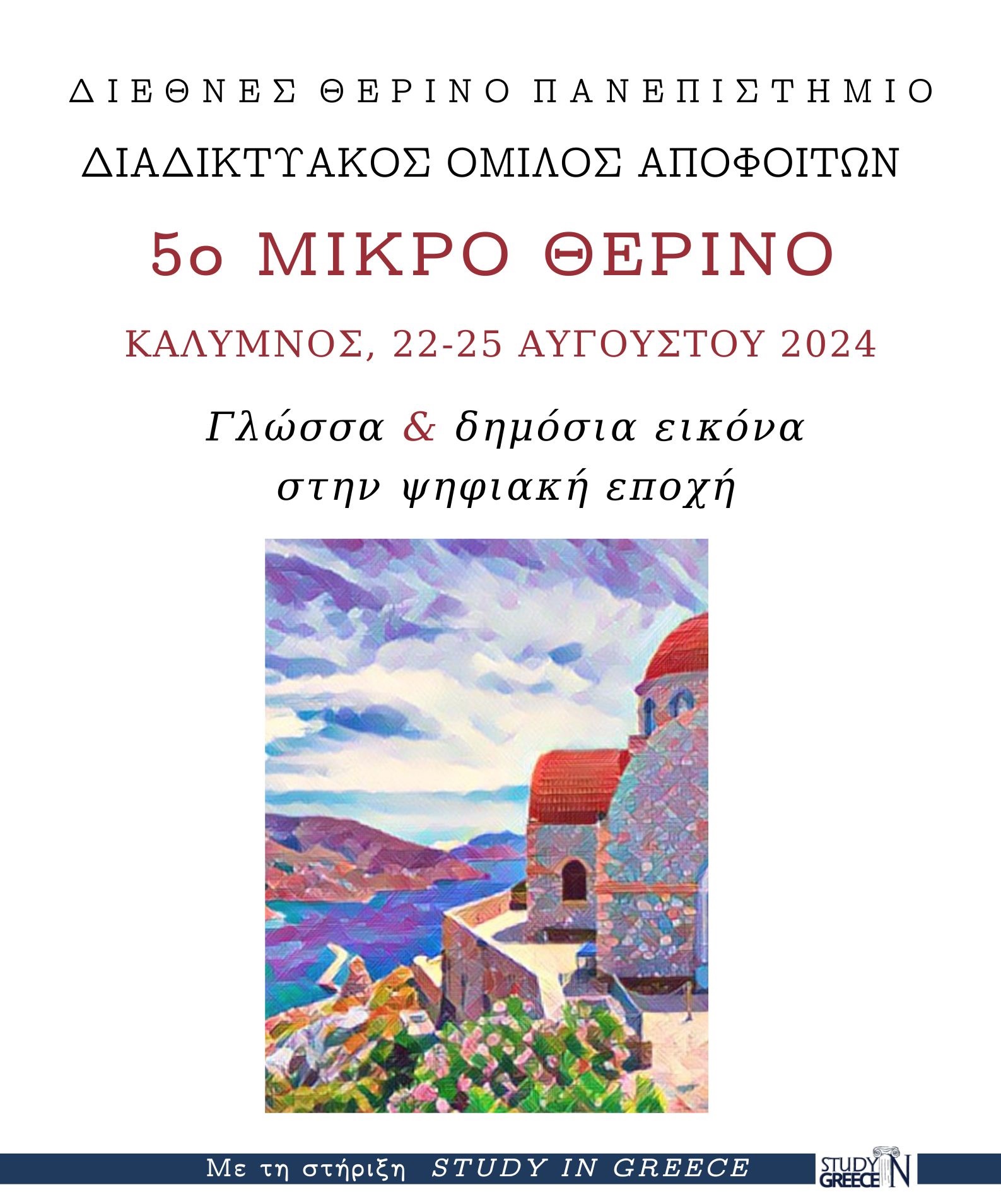 Φέτος, βρίσκεται ήδη στην 5 η χρονιά του και θα ταξιδέψει στην Κάλυμνο. Το 5 ο «Μικρό Θερινό» θα έχει τον ειδικότερο τίτλο «Γλώσσα και δημόσια εικόνα στην ψηφιακή εποχή» και θα πραγματοποιηθεί στο νησί των σφουγγαράδων από 22-25 Αυγούστου, σε συνεργασία με τον δήμο Καλυμνίων.