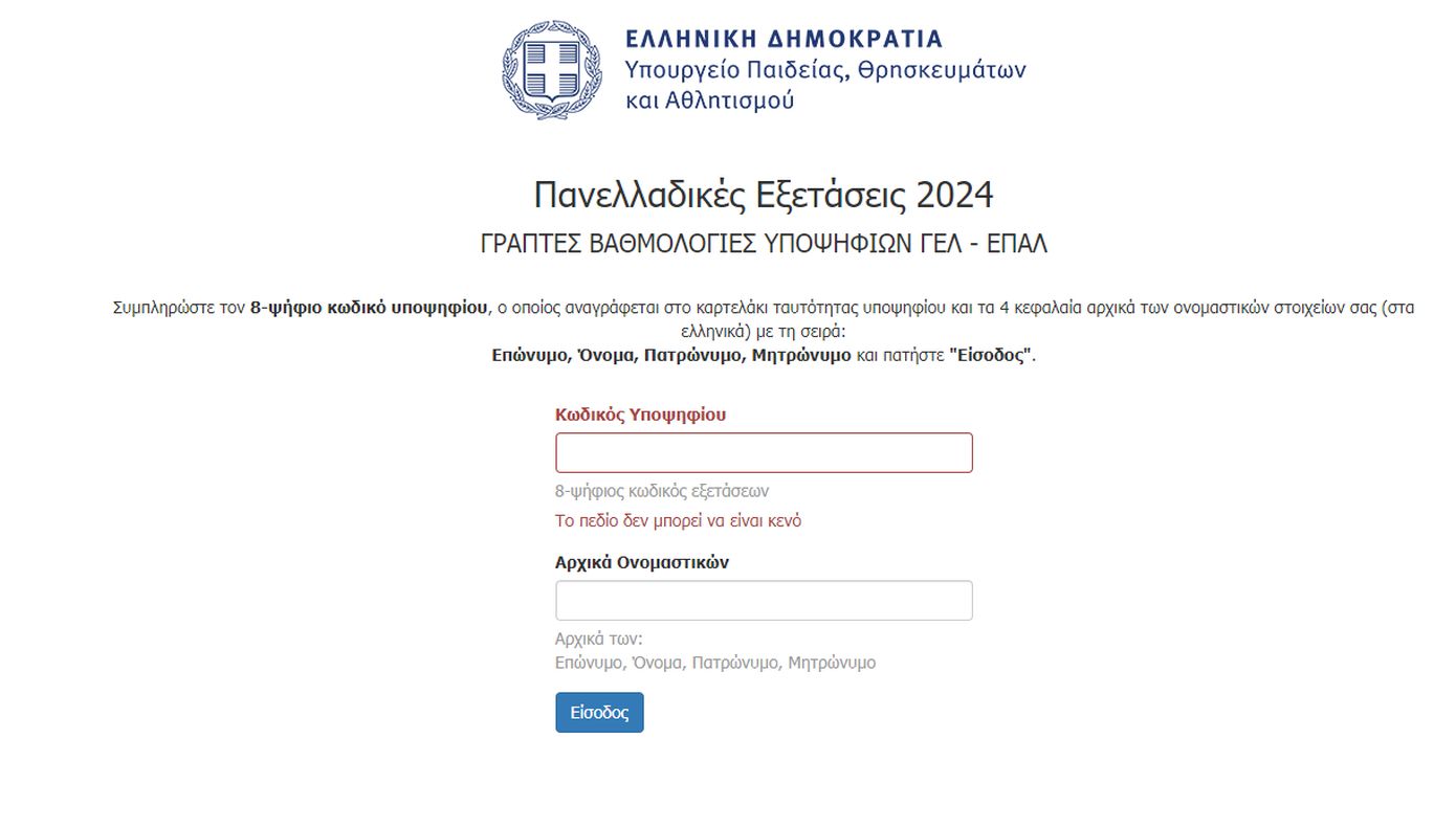 Άνοιξε η πλατφόρμα του υπουργείου Παιδείας, στην οποία είναι αναρτημένες οι βαθμολογίες των υποψηφίων των Εξετάσεων Γενικών Ενιαίων Λυκείων (ΓΕΛ) και Επαγγελματικών Λυκείων (ΕΠΑΛ) για τις φετινές Πανελλαδικές Εξετάσεις 2024.