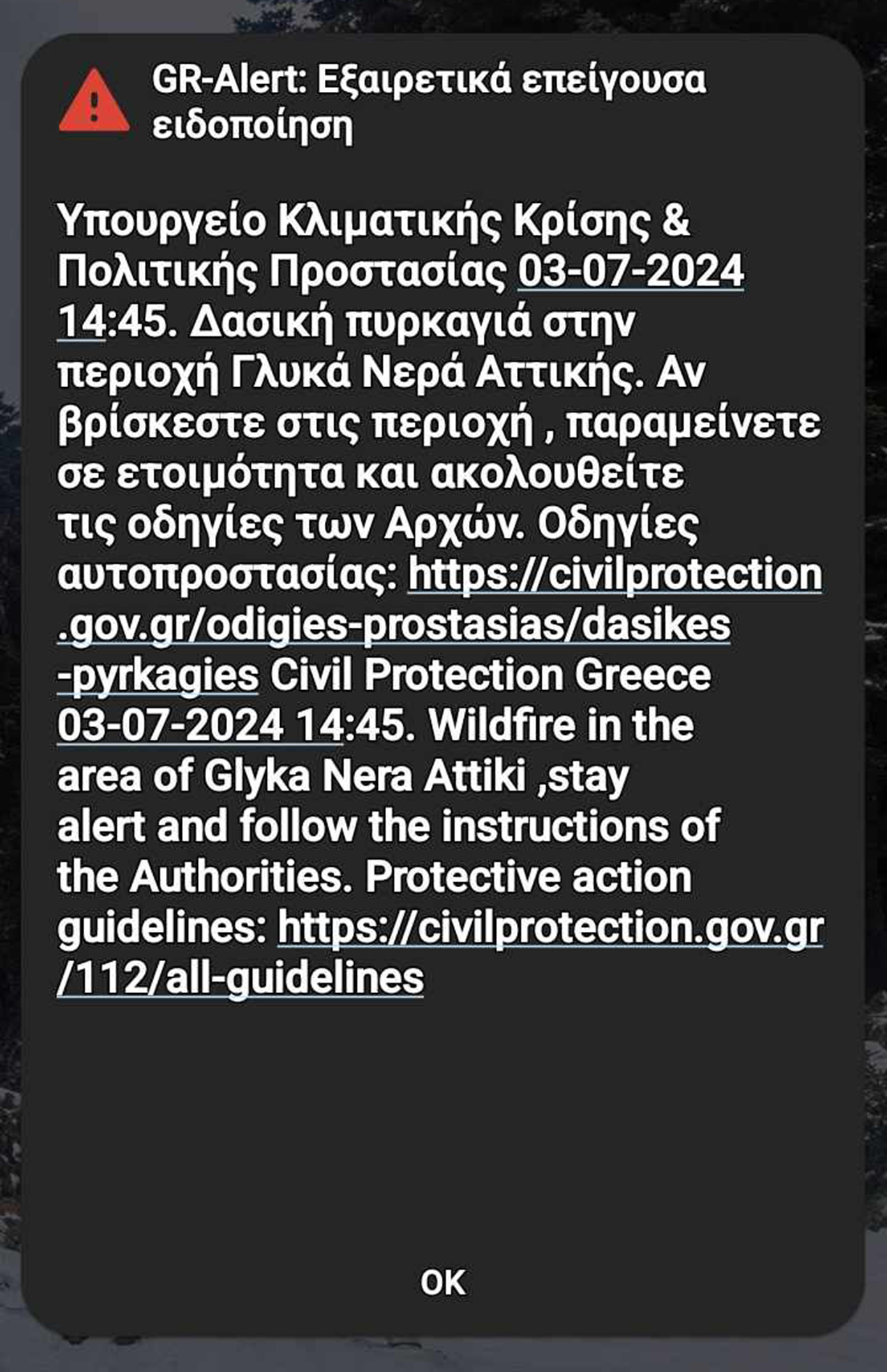 Φωτιά ξέσπασε το μεσημέρι της Τετάρτης (03/07) στα Γλυκά Νερά. Η Πυροσβεστική ειδοποιήθηκε στις 14:20 περίπου για την πυρκαγιά, ενώ εστάλη μήνυμα από το 112: «Παραμείνετε σε ετοιμότητα και ακολουθήστε τις οδηγίες των Αρχών».