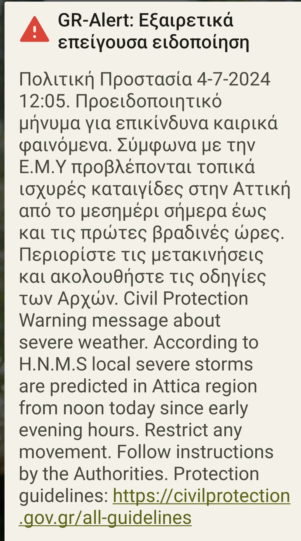 Προειδοποιητικό μήνυμα έλαβαν πολίτες της Αττικής από το 112 για επικίνδυνα καιρικά φαινόμενα. «Προειδοποιητικό μήνυμα για επικίνδυνα καιρικά. Σύμφωνα με την ΕΜΥ, προβλέπονται τοπικά ισχυρές καταιγίδες στην Αττική από το μεσημέρι σήμερα έως και τις πρώτες πρωινές ώρες. Περιορίστε τις μετακινήσεις και ακολουθείστε τις οδηγίες των Αρχών», αναφέρει το μήνυμα.